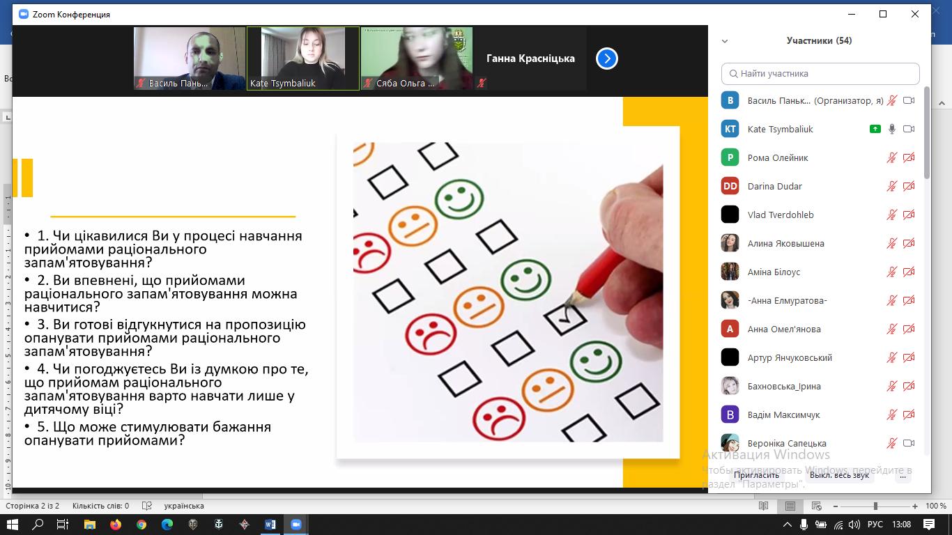 Цимбалюк Катерина доповідь на тему «Удосконалення прийомів запам’ятовування майбутніх фахівців готельно-ресторанної справи»;
