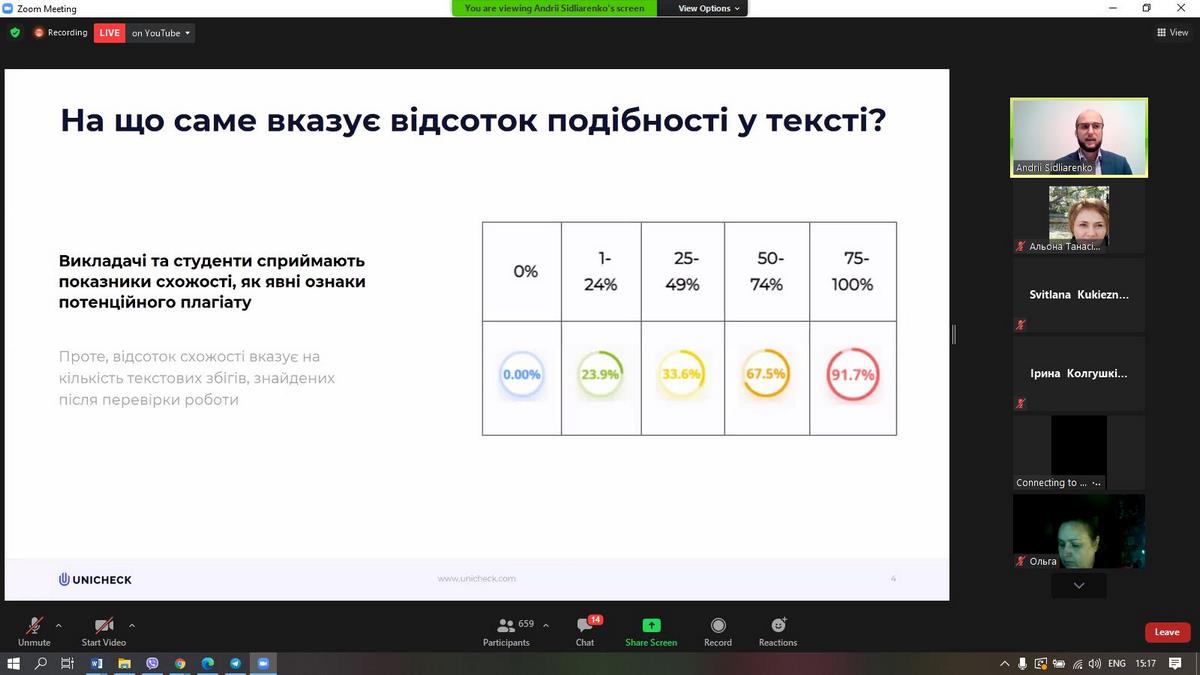 Щиро дякуємо команді Unicheck та Academic IQ за організацію заходу, особисто Андрію Сідляренко за обмін досвідом, за практичні поради щодо аналізу звіту про перевірку на плагіат.