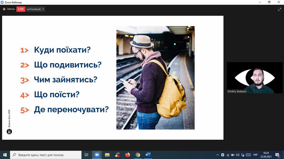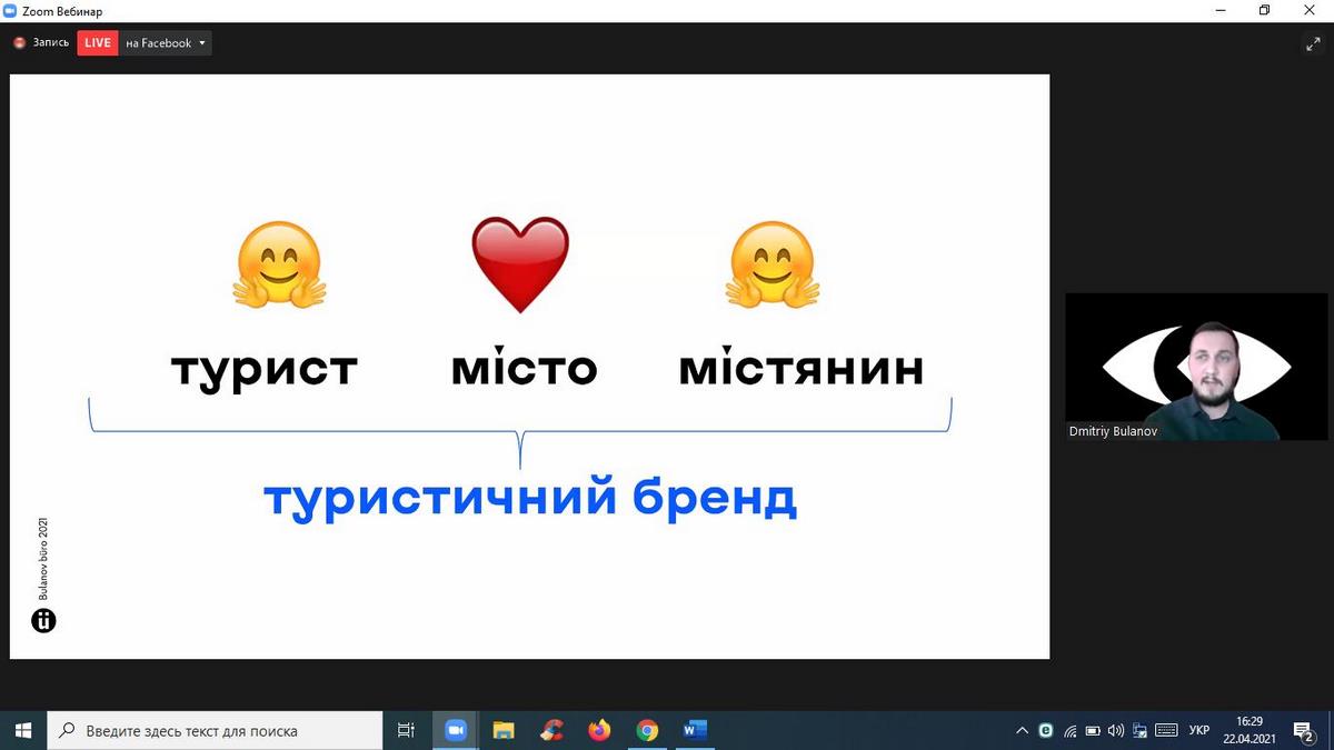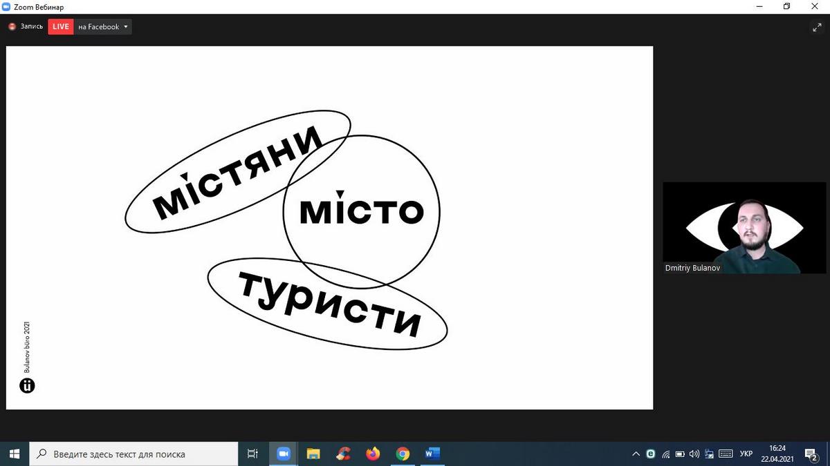 Для чого містам потрібен бренд та як він розробляється? Як створюється айдентика територій? Як працює айдентика як інструмент просування туристичних брендів? Відповідь на ці та багато інших запитань дав спікер вебінару Дмитро Буланов – креативний директор Bulanov Buro, арт-директор Zruchno travel, член Асоціації Індустрії Гостинності України, співавтор айдентик туристичного бренду України, автор проектів туристичного бренду міста Запоріжжя, Генічевська, Кам’янка-Бузького, Скадовськогго району, Черкащини, Приазов’я.