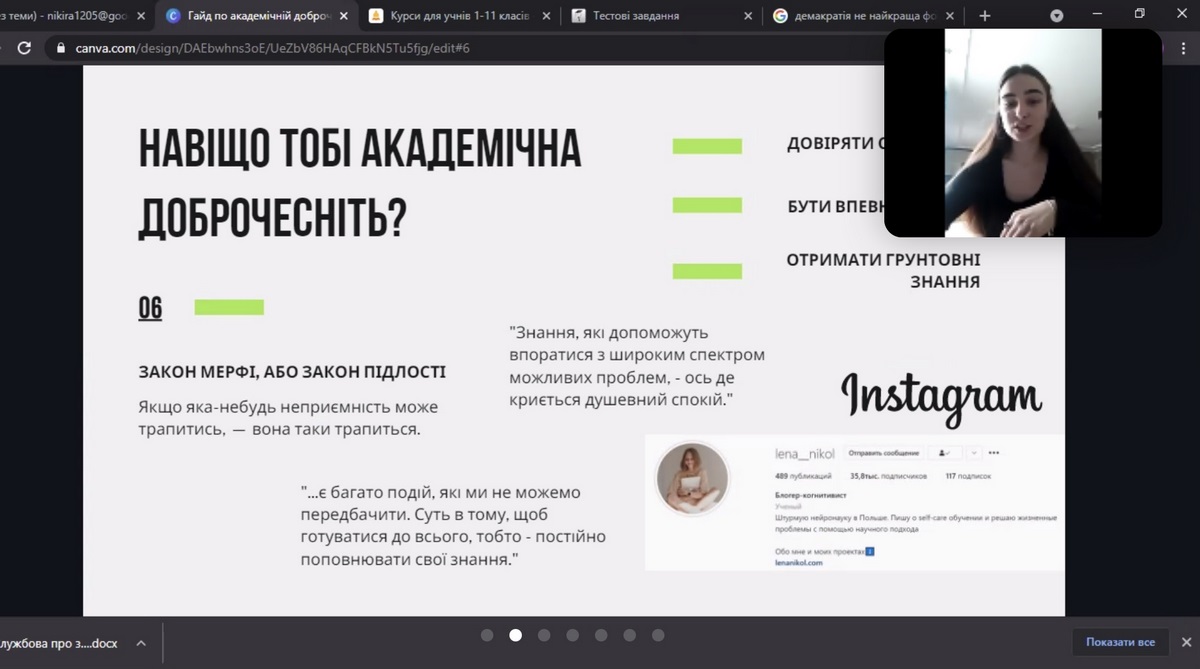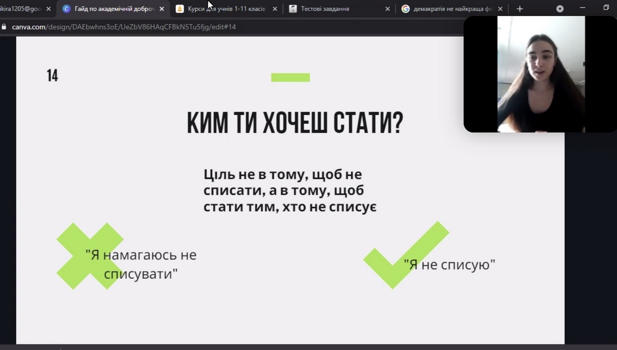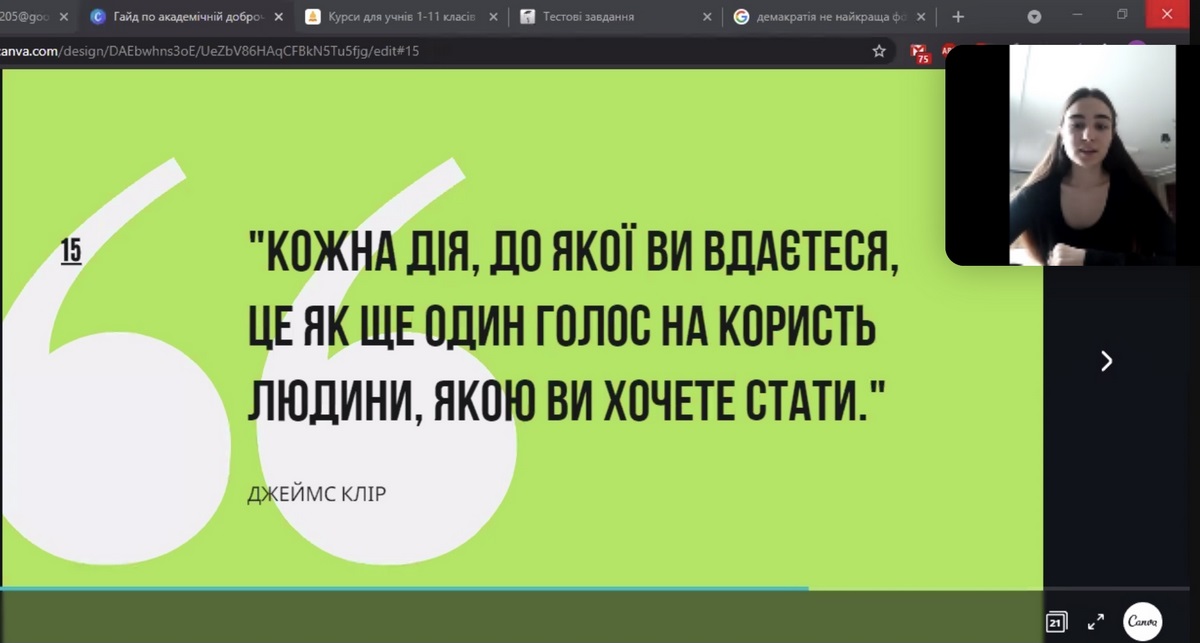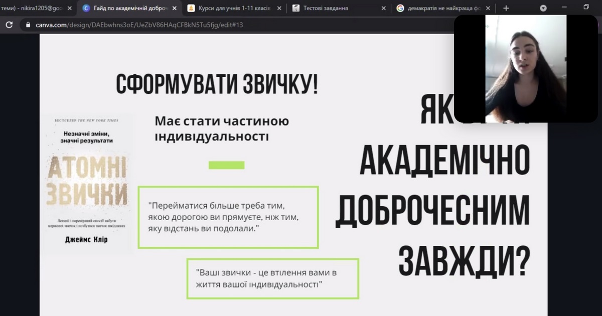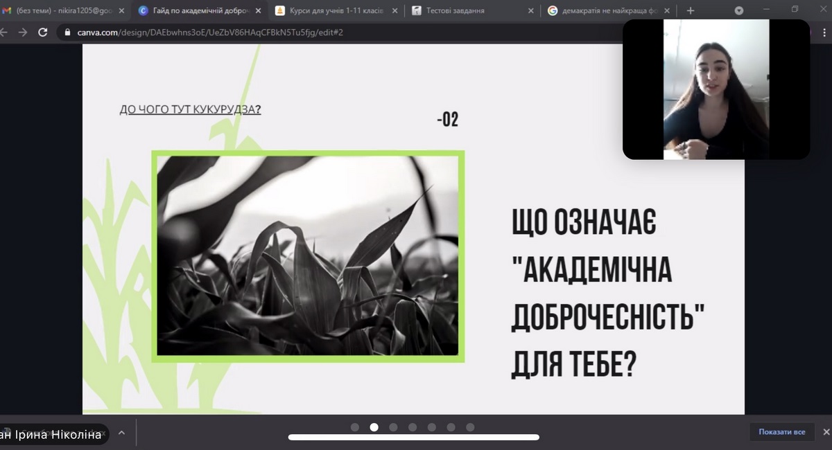 Валерія Кузінська майстерно залучила до бесіди як студентів, так і НПП, задаючи такі запитання, як «Що таке академічна доброчесність?», «Що означає саме для тебе академічна доброчесність і до чого тут кукурудза?», «Як бути академічно доброчесним?», «Як виробити доброчесні звички?» та багато інших дискусійних запитань, а також надала ряд рекомендацій!