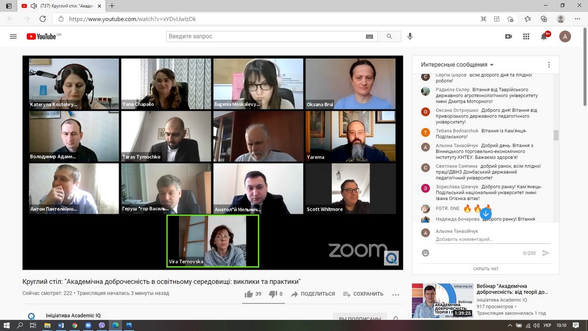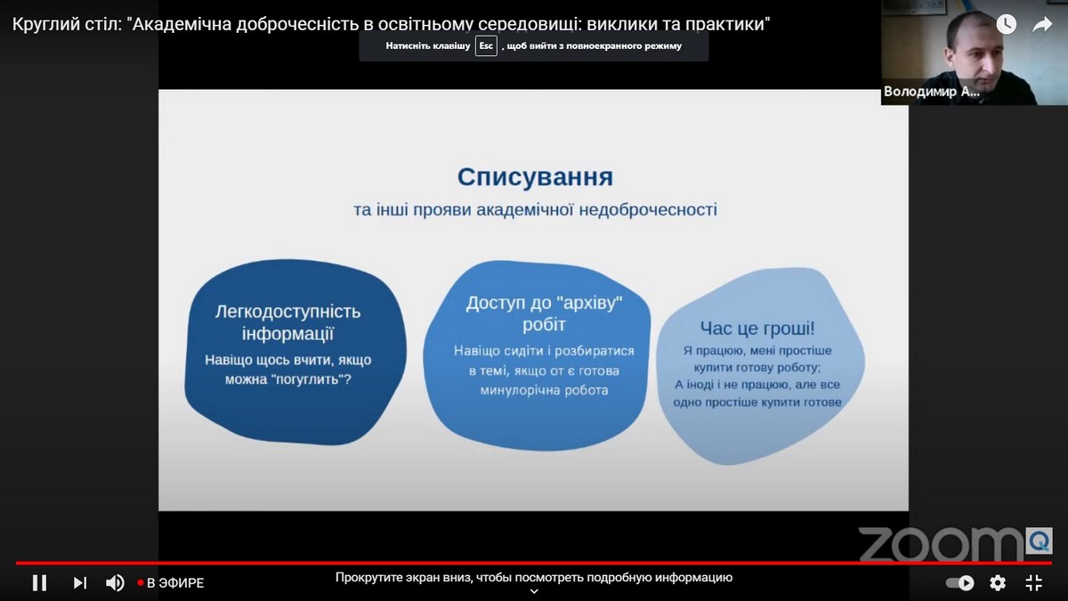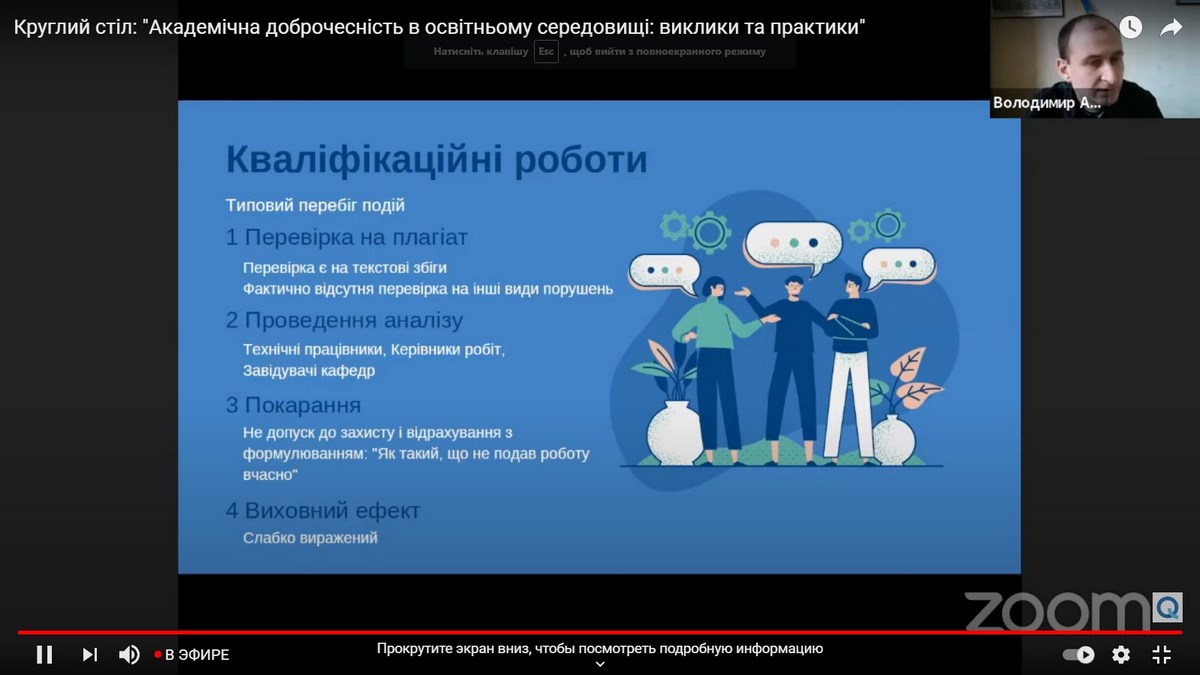 Учасники круглого столу ознайомилися з практичними кейсами розроблення та впровадження університетських політик академічної доброчесності в Україні, дізналися як налагоджується процес комунікації зі студентами та викладачами, які необхідні ресурси для забезпечення академічної доброчесності використовуються різними закладами вищої освіти, як здійснюється моніторинг за дотриманням академічної доброчесності.