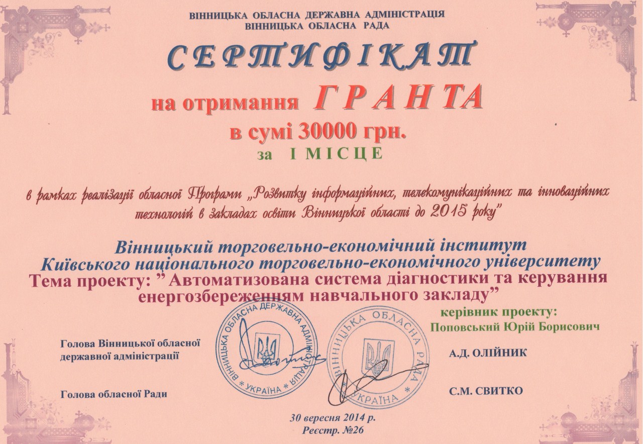 Відповідно до Програми розвитку інформаційних, телекомунікаційних та інноваційних технологій в закладах освіти Вінницької області у 2014-2015 н.р. на конкурс було подано 47 проектів. За рішенням експертної ради, створеної при Департаменті освіти і науки облдержадміністрації. В номінації вищі навчальні заклади ІІІ-ІУ р.а. І місце отримав Вінницький торговельно-економічний інститут Київського національного торговельно-економічного університету – «Автоматизована система діагностики та керування енергозбереженням навчального закладу». Сертифікат на отримання ГРАНТА вручили директору ВТЕІ КНТЕУ Замковій Н.Л. та керівнику Центру інформаційних технологій та навчально-тренінгових фірм ВТЕІ КНТЕУ Поповському Ю.Б.