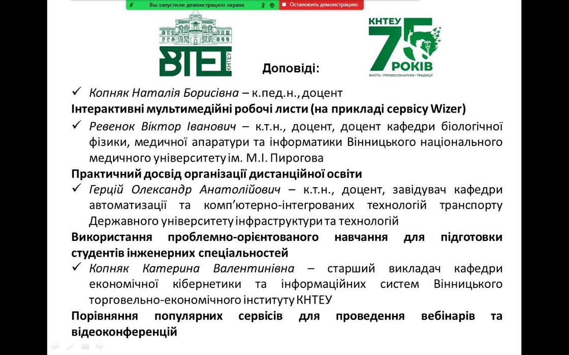 У ході семінару обговорювались актуальні в наш час питання використання інтерактивних мультимедійних робочих листів, реалізації електронного журналу викладача у різних закладах вищої освіти, впровадження сучасних освітніх середовищ та платформ для відеоконференцій в умовах дистанційного та змішаного навчання, а також засобів для проведення вебінарів та віддалених бізнес-нарад, порівняння їх можливостей тощо. Дякуємо колегам за обмін досвідом у реалізації передових освітніх технологій, методів, форм і засобів навчання!