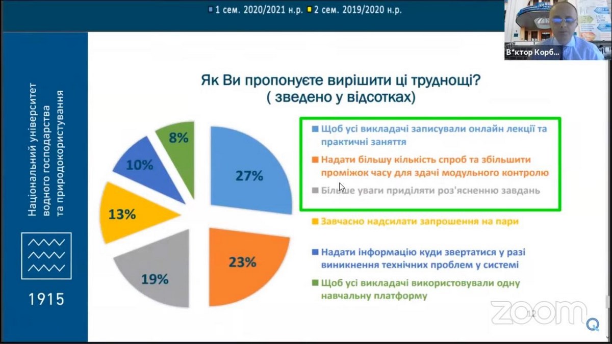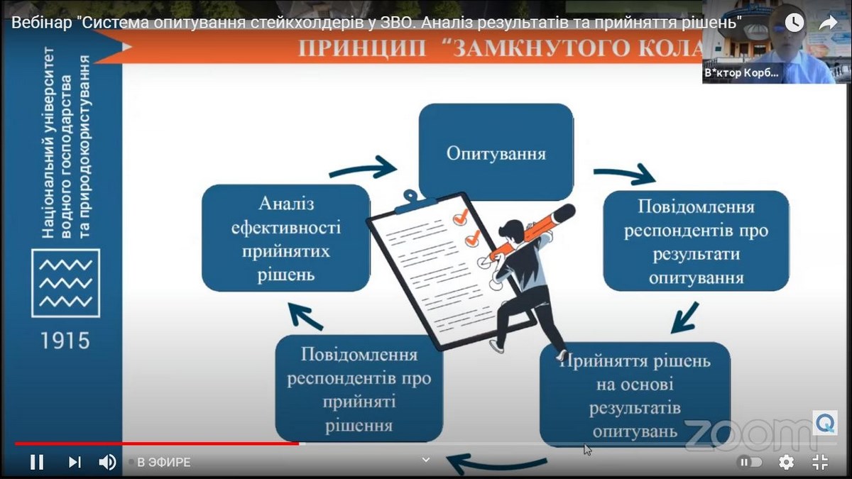 Спікер заходу – Віктор Корбутяк, доцент, кандидат технічних наук, начальник відділу якості освіти Національного університету водного господарства та природокористування (м. Рівне), експерт Національного агентства забезпечення якості вищої освіти запропонував на розгляд методи проведення опитування та визначив можливості для покращення системи анкетування у ЗВО.