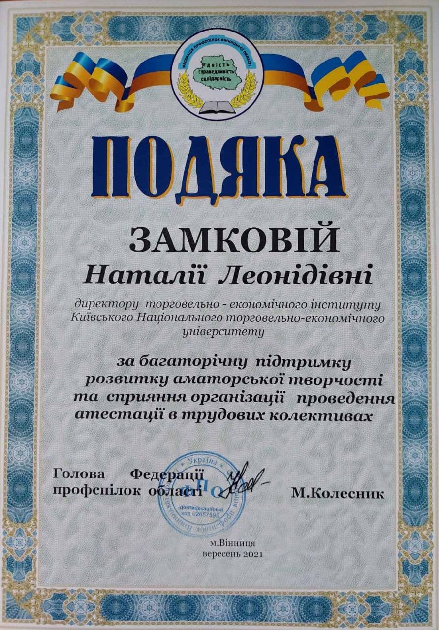 Щирі слова подяки та вдячності керівництво Федерації профспілок області висловили директору ВТЕІ КНТЕУ Наталії Замковій.