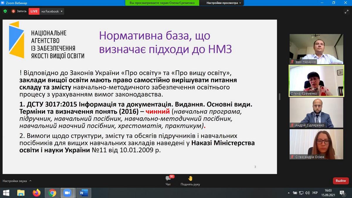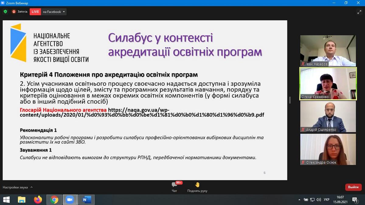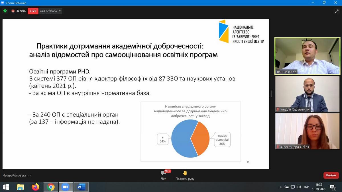 ЖЧленом Національного агентства із забезпечення якості вищої освіти Іваном Назаровим було роз’яснено питання щодо понять академічної доброчесності та його нормативного регулювання, політики, стандартів і процедур дотримання та законодавчих ініціатив Національного агентства у сфері формування простору академічної доброчесності. Визначено основні завдання проєкту Закону «Про академічну доброчесність», а саме акумулювання правового регулювання академічної доброчесності; визначення закладів вищої освіти головним суб’єктом забезпечення дотримання принципів академічної доброчесності з надання їм додаткових можливостей реагування на її порушення; стимулювання закладів вищої освіти та наукових установ до реального дотримання принципів академічної доброчесності через запровадження відповідальності за неспроможність ідентифікувати порушення та протистояти їм.