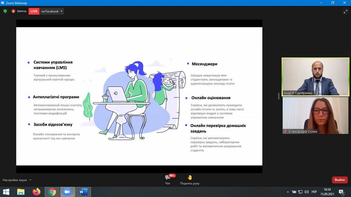 Андрій Сідляренко, експерт з академічної доброчесності, комерційний директор Unicheck Україна, поділився п’ятьма ключовими компонентами культури академічної доброчесності та її впровадження у закладі вищої освіти. Розкрив питання щодо використання програмних продуктів для забезпечення академічної доброчесності навчально-методичних матеріалів та визначив переваги використання системи управління навчанням у навчальному процесі (навчальні матеріали онлайн, перевірка знань студентів, отримання результатів та комунікація зі студентами).