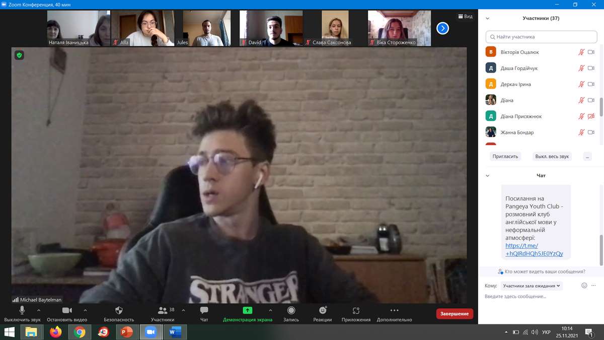 25 листопада 2021 року кафедра іноземної філології та перекладу продовжила серію майстер-класів за підтримки ГО Pangeya Ultima та волонтерів Європейського корпусу солідарності. Цього разу говорили про те, якими є захоплення сучасної молоді в різних країнах та як вони впливають на професійний розвиток. Гості з Нідерландів та Франції разом зі студентами спеціальностей «Філологія» та «Підприємництво та торгівля» обговорювали найбільш популярні хобі, які допомагають креативно мислити й керувати часом, комунікувати, формують навички нетворкінгу та командної роботи. Дякуємо нашим колегам за співпрацю та корисну розмову!