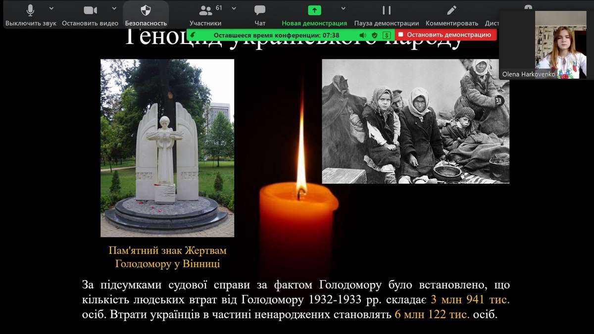 25 листопада 2021 року на обліково-фінансовому факультеті Вінницького торговельно-економічного інституту КНТЕУ відбулась загальнофакультетська кураторська година «Голодомор 1932-1933 років: історія трагедії», яку підготувала та провела рада студентського самоврядування факультету. Ведучою заходу виступила Олена Харковенко, студентка групи ФБСС-11д, заступниця голови Студентської ради Вінниччини. Щороку наприкінці листопада в Україні вшановують пам’ять мільйонів жертв голодоморів. У ХХ столітті українці пережили їх тричі. Наймасштабнішим за кількістю людських жертв визначено голодомор 1932-1933 років, який називають геноцидом українського народу. Його жертвами в Україні стали, за різними даними, від 3,9 до 7 мільйонів людей. Саме історії цього голодомору, політичним передумовам та хронології тих жахливих подій було приділено найбільше уваги під час онлайн-заходу. Запрошуємо всіх долучитись до Всеукраїнської акції «Запали свічку пам’яті у своєму вікні!» до Дня пам’яті жертв голодоморів та спільної хвилини мовчання, яка цьогоріч відбудеться 27 листопада о 16.00. Ми маємо пам’ятати, щоб не допустити вороття!