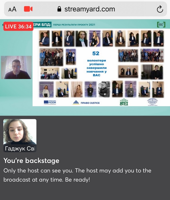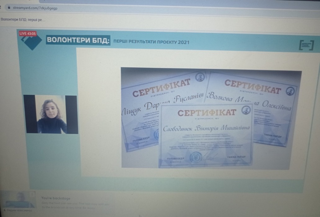 3 грудня 2021 року Координаційний центр з надання правової допомоги проводив презентацію перших результатів проєкту «Волонтер БПД» у 2021 році, де волонтери із різних областей України поділилися мотивами участі у проєкті, своїм найкращим досвідом та здобутками.