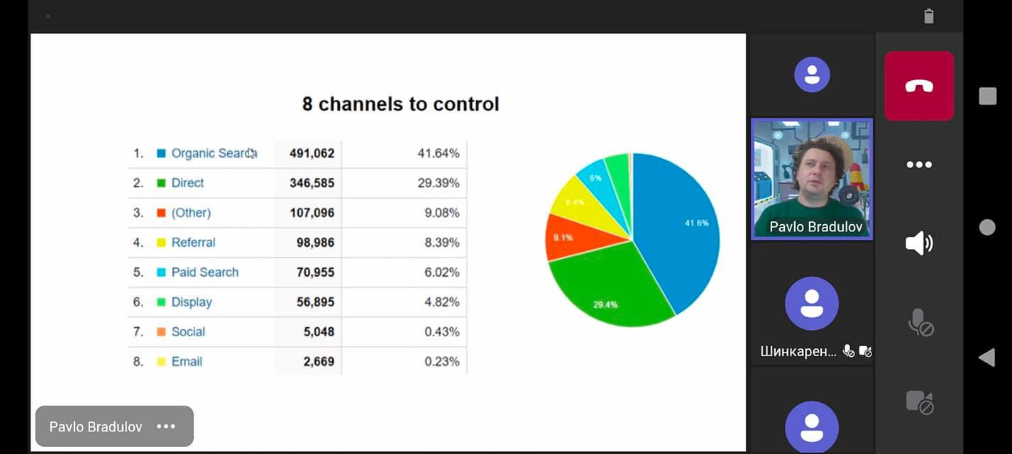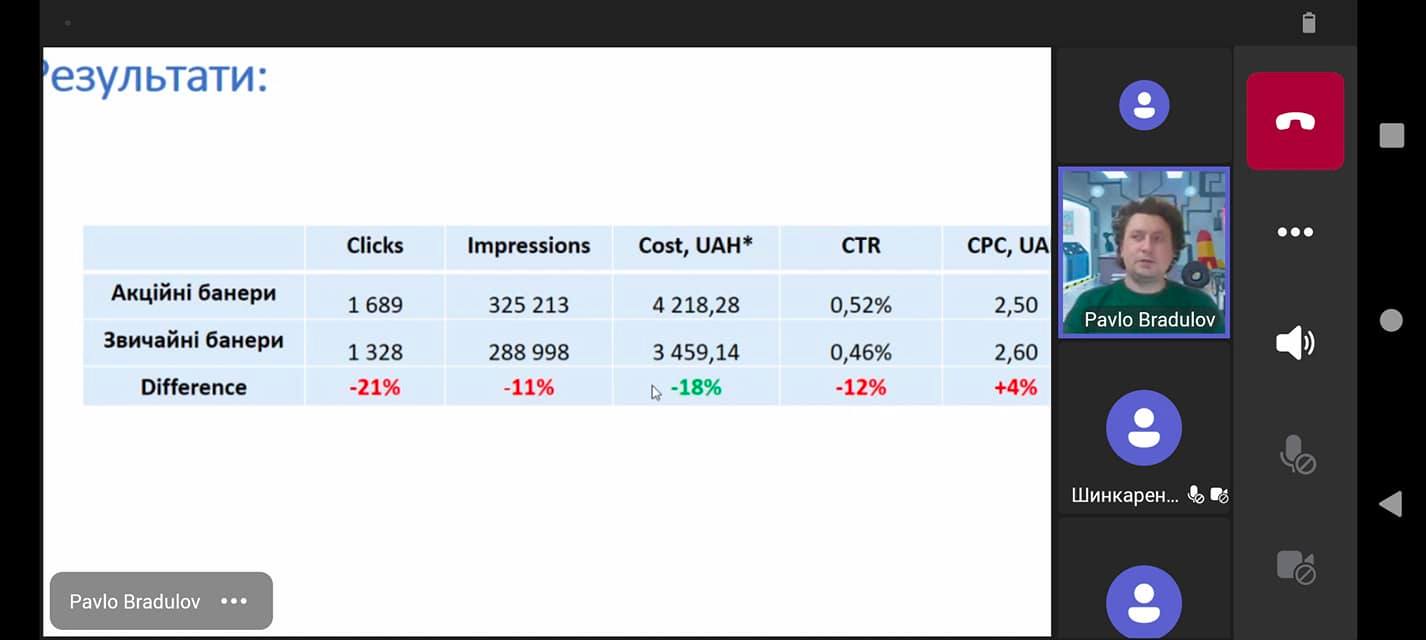 Павло розповів яким чином застосовуються в компанії інструменти Google-аналітики, а саме: як побудувати систему метрик, зберігати дані, об'єднувати дані з різних джерел, перевіряти гіпотези за допомогою А/В - тестів через Google Optimize та створювати систему наскрізної аналітики. Гостру дискусію викликали питання ефективності застосування Google аналітики при оцінюванні маркетингових показників різних діджитал каналів.