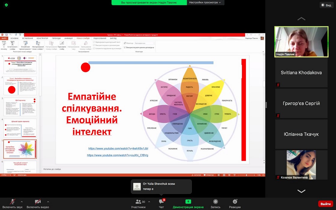 В ході 3 денного семінару слухачі дізналися, що означає емпатійне спілкування, навчилися визначати компетенції емоційного інтелекту, формувати здатність концентрувати увагу на самоусвідомленні, на своїх відчуттях. < Учасники семінару разом з професійним тренером – Надією Павлик розглядали різні аспекти спілкування, що блокує співпереживання, виконували вправи на порівняння різних типів спілкування. Вивчали 4 кроки ненасильницького (емпатійного) спілкування, здійснювали аналіз діалогів. Цікавою для слухачів семінару стала інформація про методику ненасильницького (емпатійного) спілкування у попередженні конфліктів в сім’ях, робочому і навчальному середовищі, а відповідно і в суспільстві.