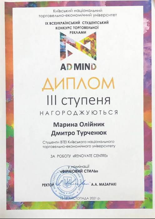 Вітаємо студентів Вінницького торговельно-економічного інституту КНТЕУ Марину Олійник та Дмитра Турченюка групи МР-42д із отриманням диплому ІІІ ступеня IX Всеукраїнського студентського конкурсу торговельної реклами у номінації фірмовий стиль за роботу "RENOVATE CENTRE".