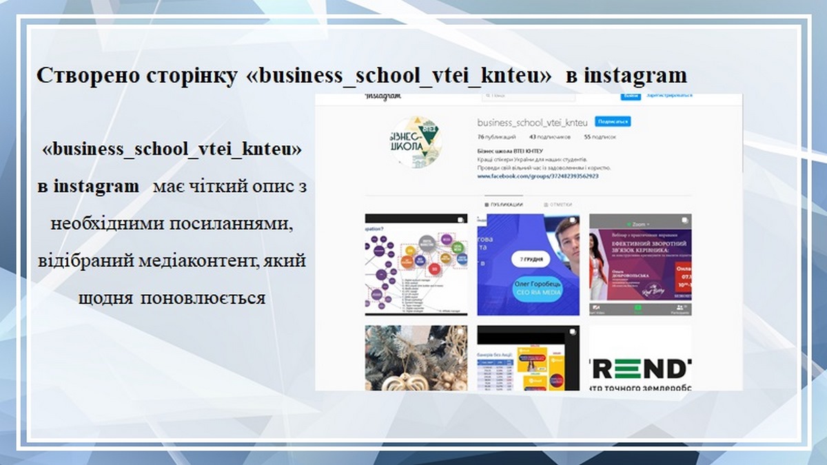 Підтвердження результатів неформального професійного навчання продемонстрували слухачі Бізнес-школи ВТЕІ КНТЕУ, успішні здобувачі вищої освіти ОП «Маркетинг», ОС «магістр», демонструючи розроблений брендбук проєкту «Бізнес-школа ВТЕІ КНТЕУ». Проте, всі ці успіхи були б неможливі без дієвої підтримки партнерів ВТЕІ КНТЕУ, представників влади і бізнесу, стейкхолдерів, провідних фахівців практиків.