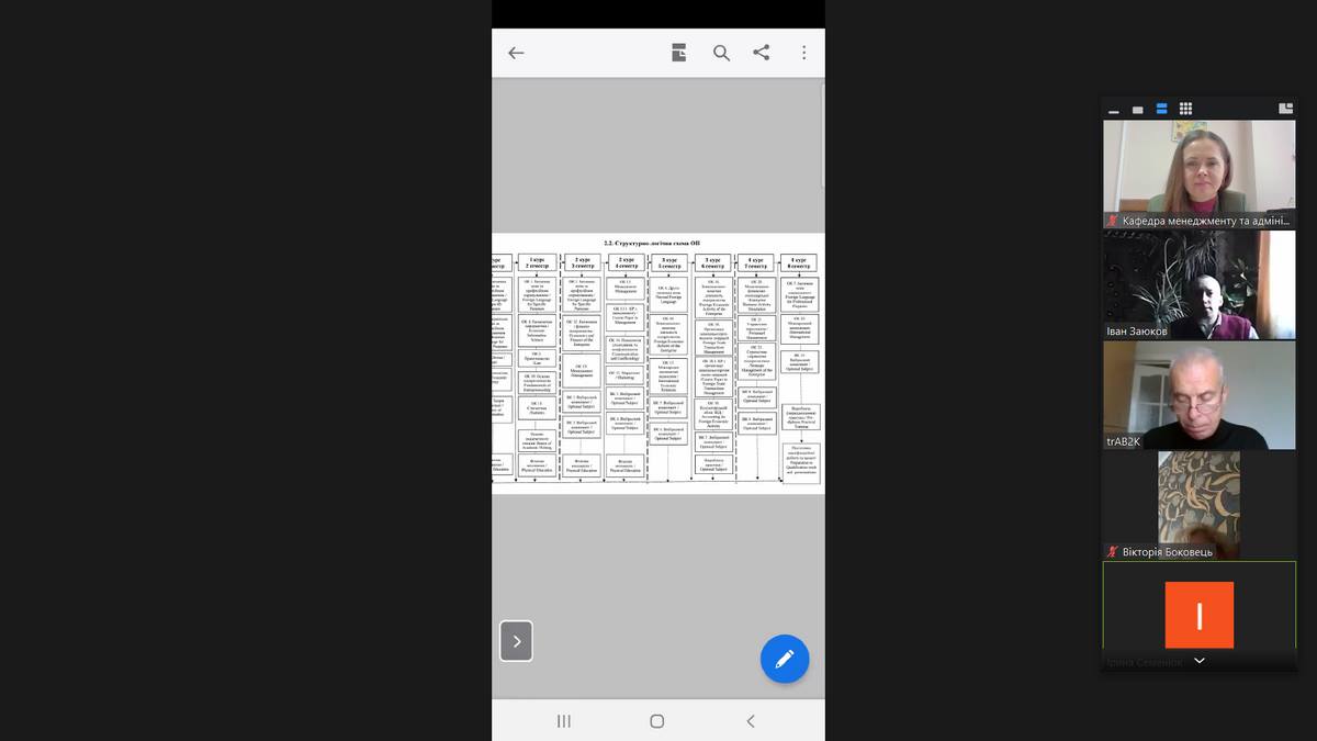 Гаранти освітніх програм проф. Вікторія Боковець, доц. Галина Іванченко, доц. Ірина Семенюк та доц. Людмила Бондарчук представили проєкти ОП. На засіданні було ґрунтовно обговорено структурно-логічні схеми навчального процесу по зазначених освітніх програмах.