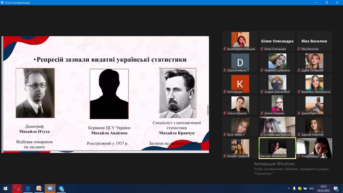 Науковий інтерес та жваву дискусію викликали доповіді: «Достовірність статистичної інформації в умовах військового стану» (Томчук Олександри – студентки групи М-11д), «Цікаві історичні факти про статистику» (Заболотної Вікторії – студентки групи М-11д), «Особливості роботи Держстату в умовах воєнного стану» (Панчук Юлії – студентки групи Е-21д), «Статистика змін валютного ринку в умовах військового стану» (Коваленко Валерії – студентки групи ОО-11д), «Статистика ринку праці в умовах військового стану» (Безверхньої Ірини – студентки групи ОО-11д) та «Вплив війни на статистику смертності в Україні» (Бозняк Інни – студентки групи ОО-11д).