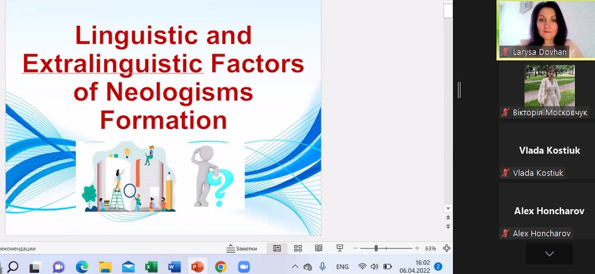У засіданні наукового гуртка взяли участь здобувачі освітнього ступеня «магістр» та «бакалавр», які презентувати доповіді на тему: “Neologisms: Word-Formation Processes” (доповідачка Владислава Костюк, група ФІП-31д), “Formation of Тeologisms as Part of Common Lexicon in English” (доповідачка Олена Бондар, група ФІП-31д), “Semantic Aspects of Neologisms in Modern English” (доповідачка Діана Слободянюк, група ФІП-31д), “Neologisms as Lexical Innovation on the Internet” (доповідачка Надія Кушнір, група ФІП-31д), “The Dictionary of Obscure Sorrows: Filling in the Gaps in the Language of Emotion” (доповідач Олександр Гончаров, група ФІП-31 д), “Functioning of Socio-Political Neologisms in English Media Discourse ” (доповідачка Вікторія Московчук, група – Ф-11в(м), “Linguistic and Extralinguistic Factors of Neologisms Formation ” (доповідачка Богдана Жовтобрюх, група МЕВ-42д); “Neologisms in the Language of Social Networks” (доповідач Роман Матвійчук, ФІП-21 д). Представлені доповіді викликали науковий інтерес та активну дискусію серед учасників засідання та були високо оцінені викладачами кафедри іноземної філології та перекладу.