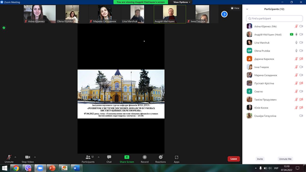 7 квітня 2022 року керівник наукового гуртка д.е.н., доцент, професор кафедри фінансів Нікітішин Андрій Олександрович, завідувач кафедри фінансів к.е.н, доцент Гнидюк Інна Вікторівна та науково-педагогічні працівники кафедри фінансів взяли участь в засіданні наукового гуртка на тему: «Удосконалення системи місцевих фінансів в умовах інституційних перетворень».