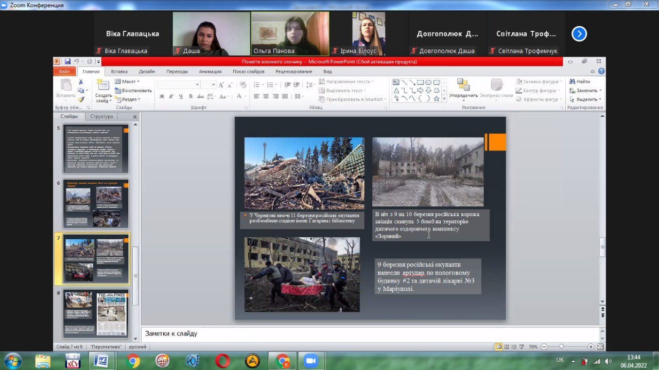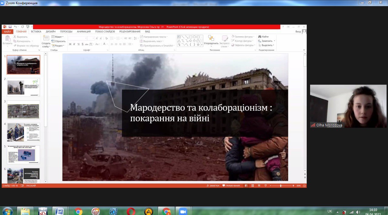 1. Поняття воєнного злочину: воєнні злочини під час війни Росії проти України - доповідачка Ольга Панова (група ПР-33д).