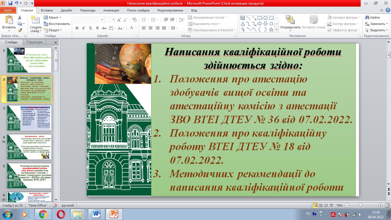 8 квітня 2022 року для здобувачів вищої освіти за спеціальностями 241 «Готельно-ресторанна справа» (освітня програма «Готельно-ресторанна справа») та 242 «Туризм» (освітня програма «Міжнародний туристичний бізнес») освітнього ступеня «магістр», к.е.н., доцентом кафедри туризму та готельно-ресторанної справи Мариною Рябенькою було проведено семінар на тему: «Кваліфікаційна робота як самостійне наукове дослідження: вимоги до виконання та захисту».