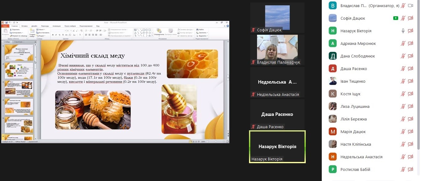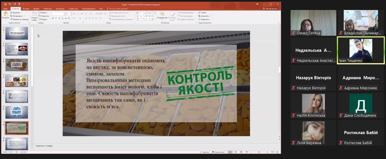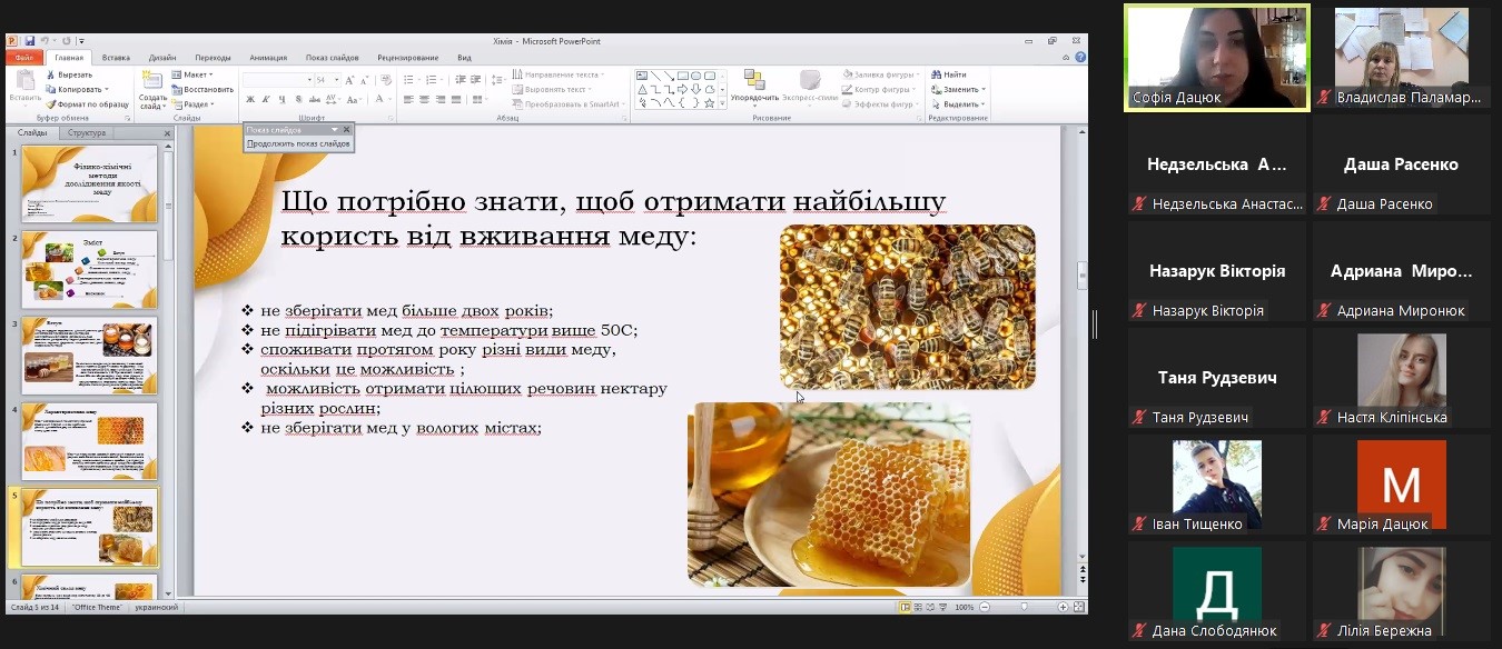 З цікавими доповідями і презентаціями виступили наступні здобувачі вищої освіти: Дацюк Софія, Назарук Вікторія «Фізико-хімічні методи дослідження якості меду», Тищенко Іван «Фізико-хімічні методи дослідження якості м’ясних напівфабрикатів», Кліпінська Анастасія «Фізико-хімічні методи дослідження молока», Луцишина Єлизавета «Фізико-хімічні методи дослідження якості хліба».