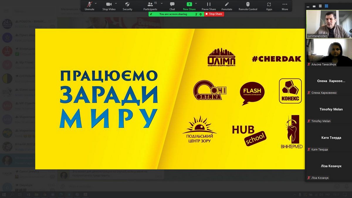 Юрій Меланишен, директор ТОВ ТРК «РЕГІОН-ІНФОРМ», розповів про механіку розробки бізнес-проєкту на прикладі проєкту «Працюємо Заради Миру», який стартував у м. Вінниці в березні 2022 року.