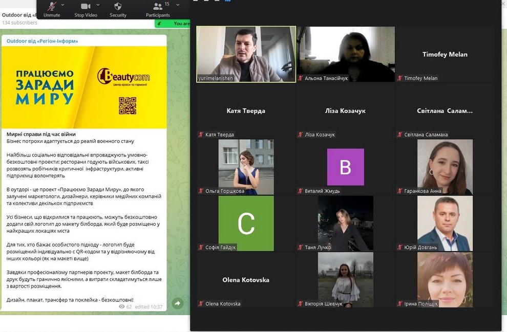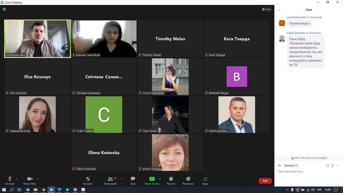 Особливу увагу Юрій Петрович приділив питанням партнерства та залучення медіа для досягнення необхідного резонансу в період війни, особливостям організації роботи команди, що розробляє креативний проєкт «Працюємо Заради Миру», коли має місце фізичне дистанціювання деяких членів команди.