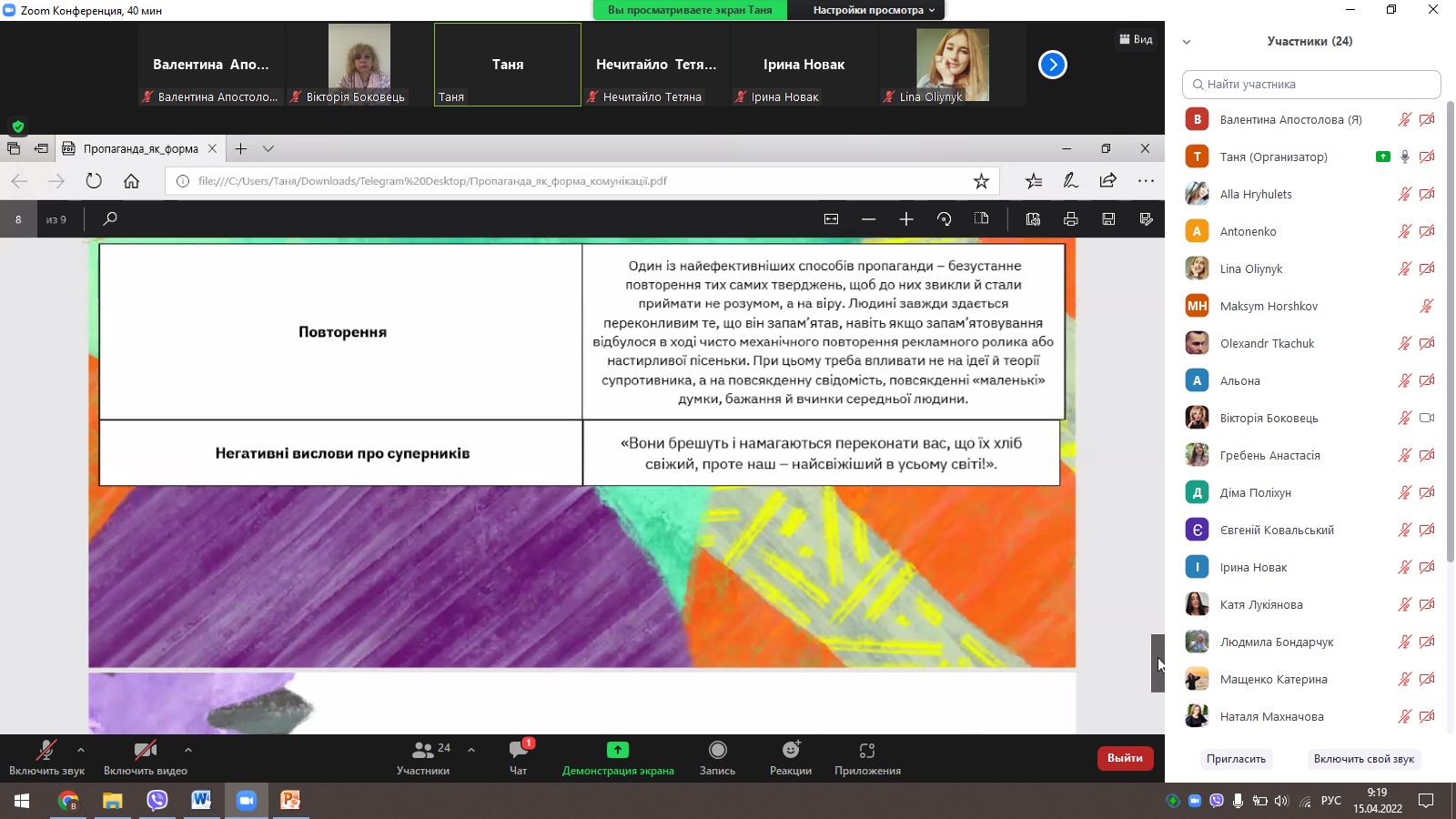На засіданні були заслухані та обговорені доповіді членів наукового гуртка – здобувачів вищої освіти спеціальності «Менеджмент»: «Пропаганда як форма комунікації» – доповідач Ірина Новак (гр. МО-42д), «Алгоритм формування комплексу комунікацій» – доповідач Тетяна Ляльчук (гр. МО-42д), «Особливості сучасних інформаційно-комунікативних технологій» – доповідач Валентина Апостолова (гр. МО-41д), «Організація прес-конференцій» – доповідач Світлана Мялковська (гр. МО-42д). Презентовані доповіді викликали жваве обговорення серед студентства та схвалення викладачів кафедри менеджменту та адміністрування.