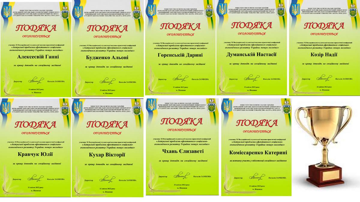 21 квітня 2022 року у рамках проведення ХІ Всеукраїнської студентської науково-практичної конференції «Актуальні проблеми ефективного соціально-економічного розвитку України: пошук молодих» відбулося засідання секції №10 «Тенденції розвитку індустрії гостинності та харчової промисловості: регіональний та національний виміри».