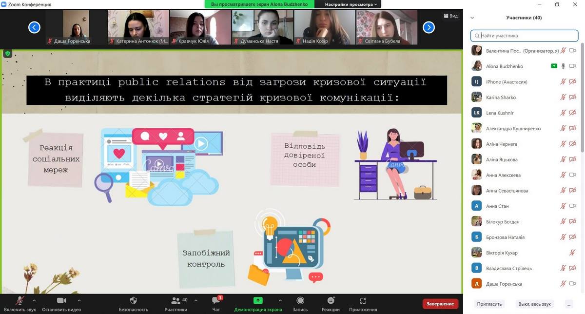 2. Будженко Альона, здобувачка вищої освіти 1 курсу, групи МТБ-11зм, з темою доповіді: «Антикризовий Public Relations як фактор захисту туристичного підприємства» (науковий керівник – к.геогр.н., доцент Алла Кізюн).