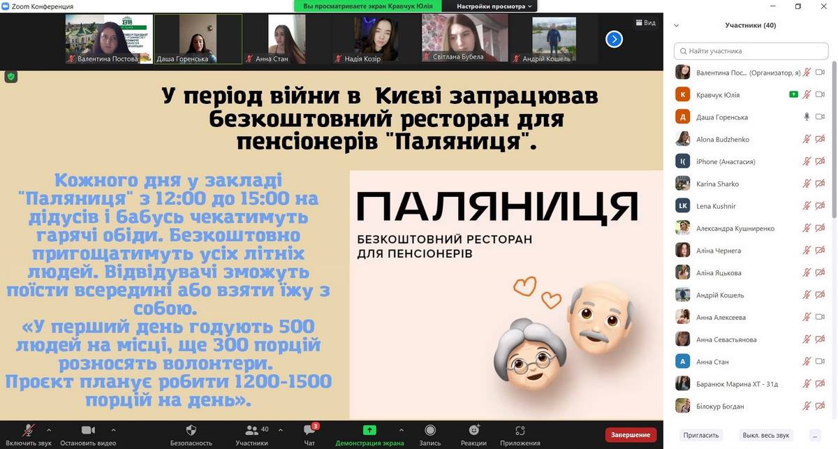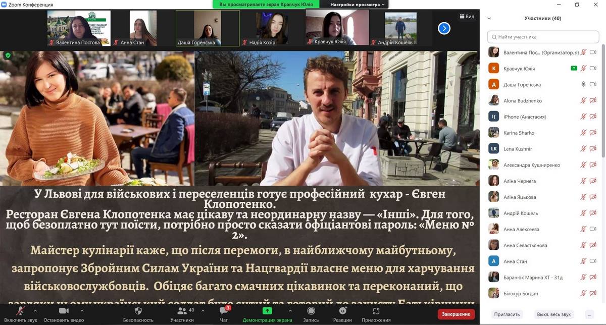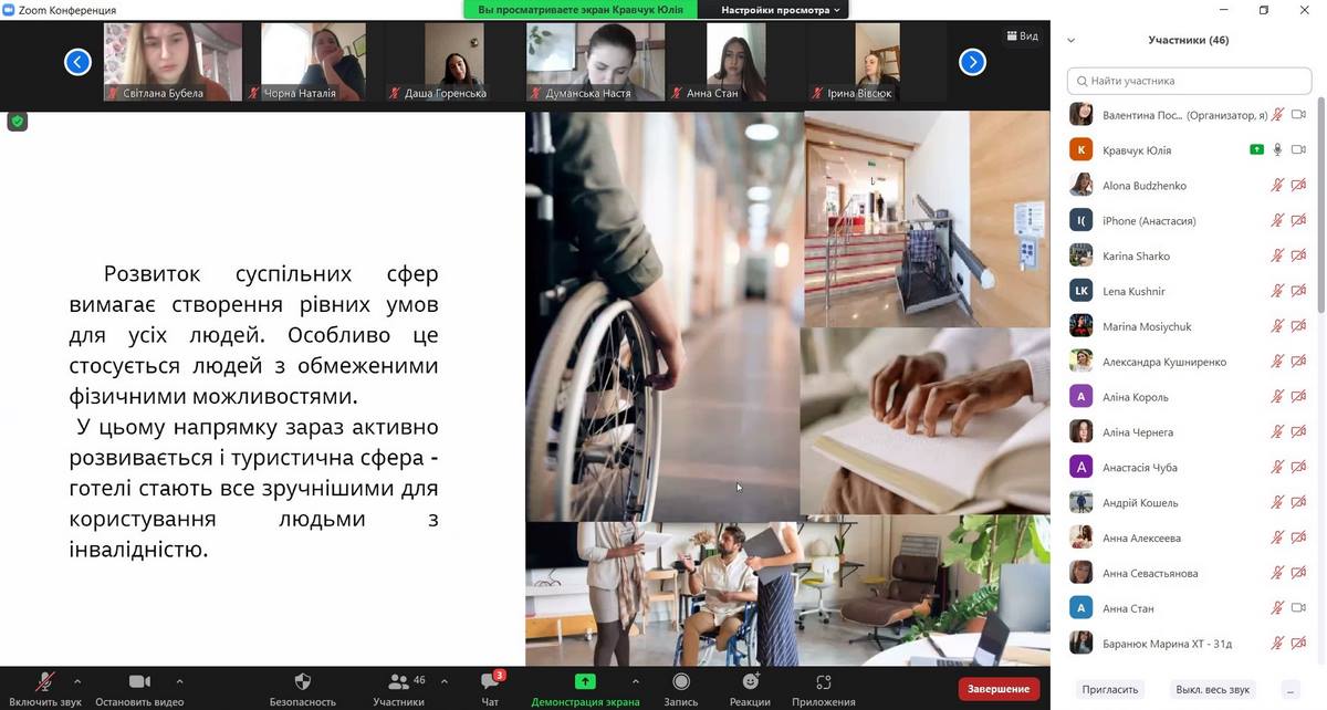 Секційне засідання проводилося в режимі відео-конференції на платформі ZOOM, до якої приєдналися здобувачі вищої освіти, які навчаються за спеціальностями «Туризм», «Готельно-ресторанна справа» та «Харчові технології», а також науково-педагогічні працівники кафедри туризму та готельно-ресторанної справи.