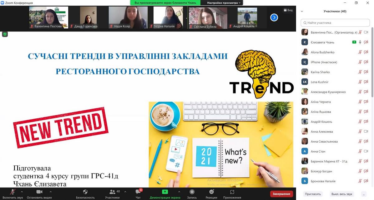 5. Чхань Єлизавета, здобувачка вищої освіти 4 курсу, групи ГРС-41д, з темою доповіді: «Сучасні тренди в управлінні закладами ресторанного господарства» (науковий керівник – к.е.н., ст. викладач Валентина Постова).