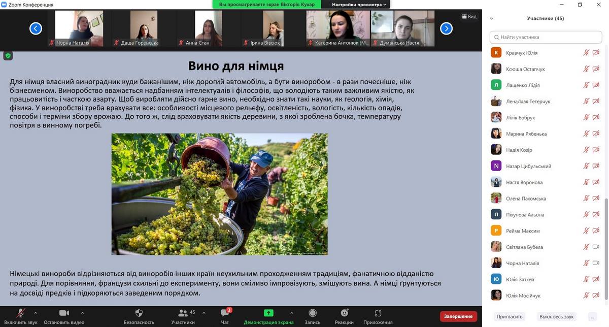 7. Кухар Вікторія, здобувачка вищої освіти 3 курсу, групи ХТ-31д, з темою доповіді: «Виноробство в Німеччині: традиції та новації» (науковий керівник – ст. викладач Ольга Іваніщева).