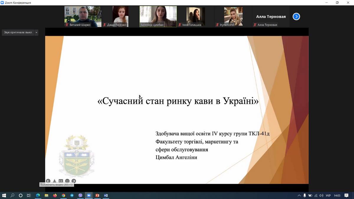 21 квітня 2022 року дистанційно на платформі Zoom було проведено засідання секції 8 «Сучасне товарознавство: інновації, проблеми якості та безпеки» в рамках XІ Всеукраїнської студентської науково-практичної конференції «Актуальні проблеми ефективного соціально-економічного розвитку України: пошук молодих».