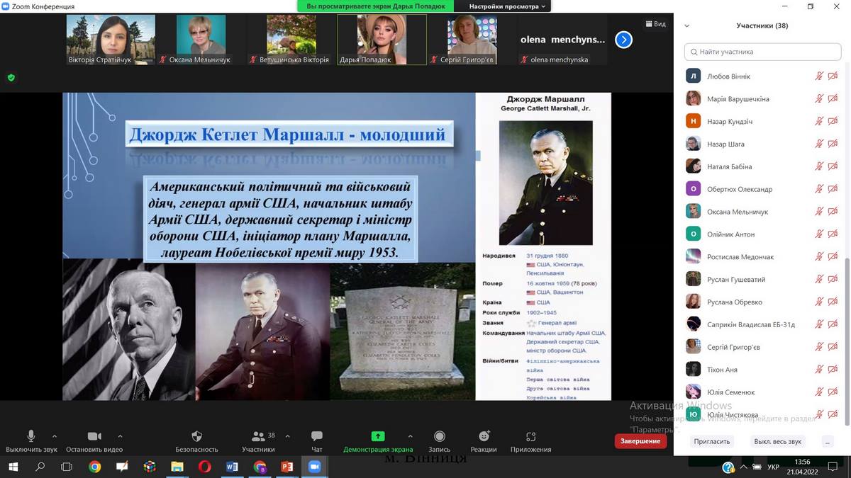 21 квітня 2022 року кафедрою економіки та міжнародних відносин проведено секційне засідання «Глобальні імперативи підприємницького потенціалу компаній на внутрішньому та зовнішньому ринках» в рамках XІ Всеукраїнської студентської науково-практичної конференції «Актуальні проблеми ефективного соціально-економічного розвитку України: пошук молодих». У засіданні взяли участь 40 осіб, серед них здобувачі вищої освіти груп ЕП-31д, ЕП-11дс, МЕВ-21д, МЕВ-41д та інших; науково-педагогічні працівники кафедри економіки та міжнародних відносин.