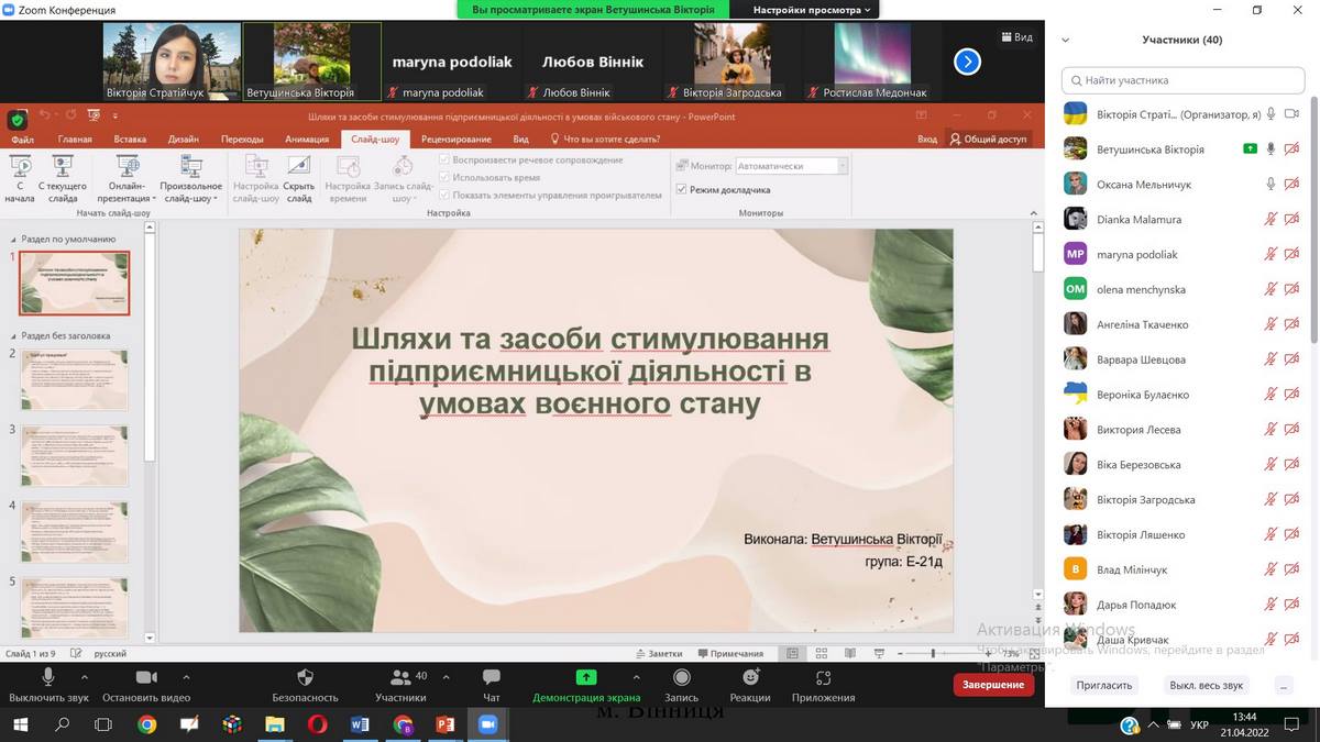 Студенти презентували цікаві та актуальні наукові дослідження, зокрема Подоляк Марина розповіла про ТНК як головного суб’єкта виробничої та інвестиційної діяльності; Ветушинська Вікторія презентувала дослідження щодо шляхів та засобів стимулювання підприємницької діяльності в умовах військового стану; Попадюк Дар’я, Томчук Олександра розглянули досвід впровадження у Європі «Плану Маршалла»; Кривчак Дарина здійснила оцінку міжнародної конкурентоспроможності олійно-жирової галузі України. Доповіді здобувачів доповнювалися жвавими дискусіями та обговоренням досліджуваних питань.