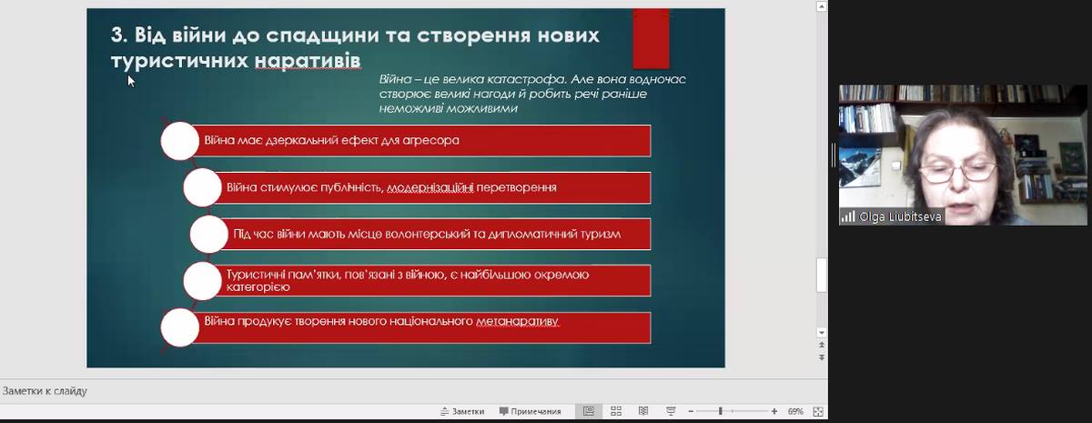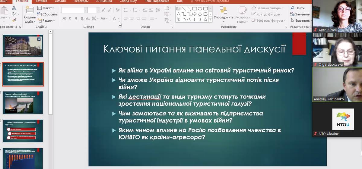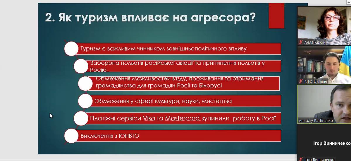 На круглому столі зазнала обговорення проблема впливу війни росії проти України на функціонування туристичної галузі в Україні та світі, а також низка дотичних питань, зокрема, чим наразі займаються підприємства туристичної індустрії України? які дестинації та види туризму стануть актуальними після війни? чи зросте інтерес в іноземних туристів до відпочинку в Україні? тощо.