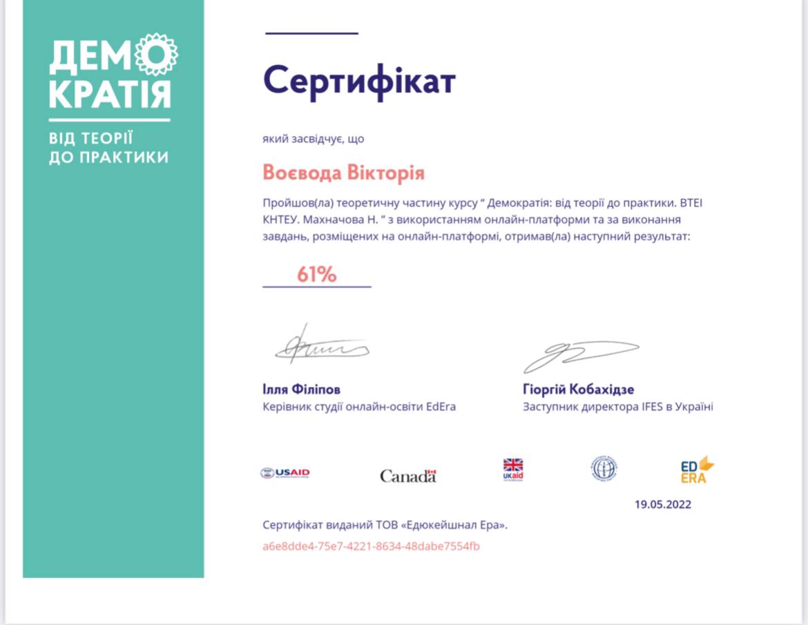 Студенти, які обрали у 2 семестрі 2021-2022 н.р. дану вибіркову дисципліну, презентували результати своєї роботи усім бажаючим, серед яких були експерти команди IFES, зокрема старша асистентка Анастасія Хорват, та запрошений експерт - випускниця ВТЕІ КНТЕУ Марина Януш, помічник-консультант народного депутата України.