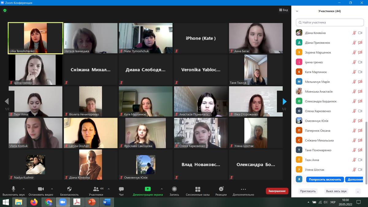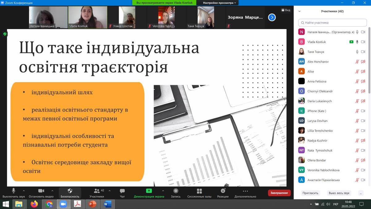 20 травня 2022 року кафедра іноземної філології та перекладу провела студентський круглий стіл «Індивідуальна освітня траєкторія студента: позитивні практики та виклики». У його роботі взяли участь студенти 1-3 курсів, які навчаються за освітньою програмою «Германські мови та літератури (переклад включно), перша – англійська». Здобувачі поділилися досвідом вибору дисциплін через автоматизовану систему SEL. Дискутували щодо задоволення професійних та особистісних потреб при формуванні індивідуальної освітньої траєкторії, порівнювали українську та закордонні практики індивідуалізації навчання. Переконалися в необхідності поглиблення фахових компетентностей через вибір спеціальних дисциплін та в створенні дружнього до студента освітнього середовища.