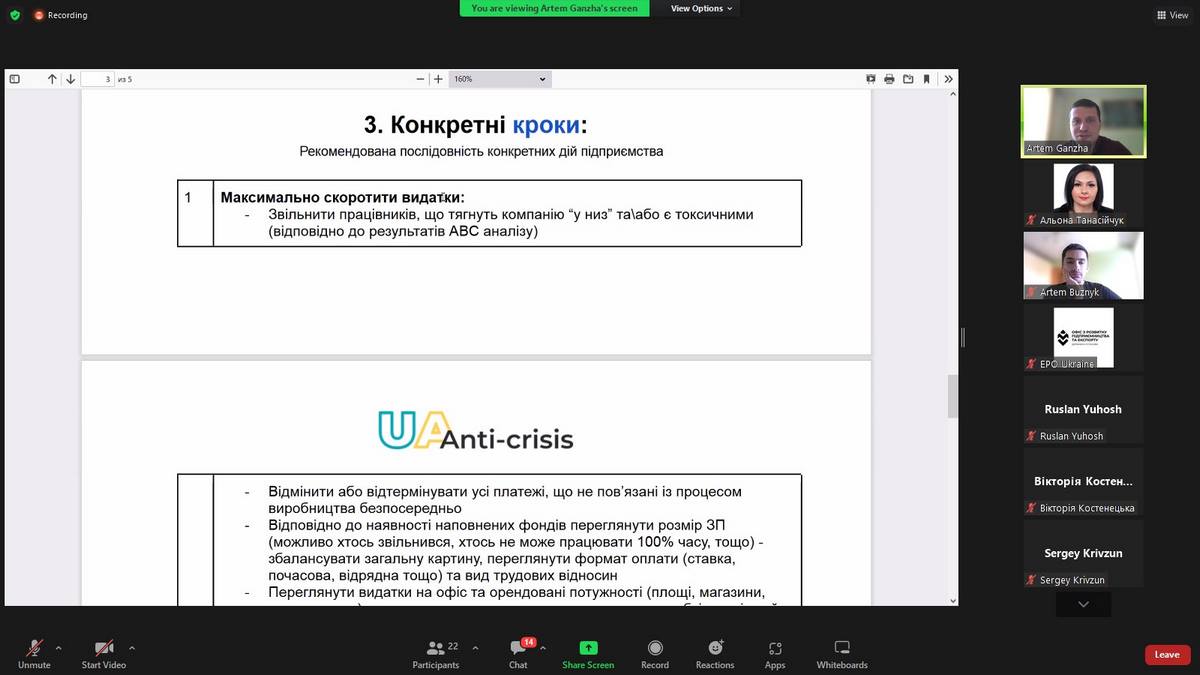 20 травня 2022 року здобувачі вищої освіти та науково-педагогічні працівники брали участь у відкритому вебінарі «Чекліст для перезапуску бізнесу», який проведено за участю Офісу з розвитку підприємництва та експорту в межах проєкту Дія.Бізнес разом з командою ініціативи «UA Anti-crisis».
