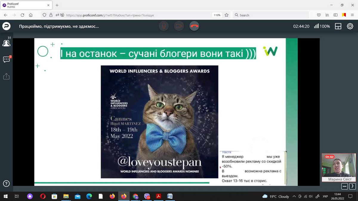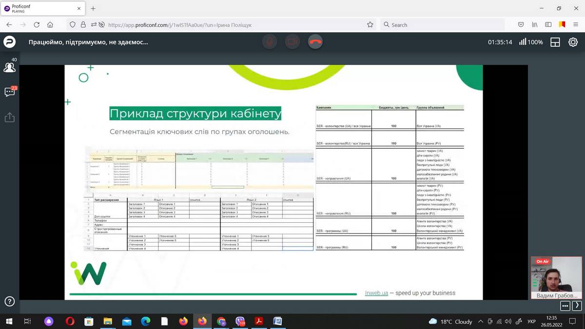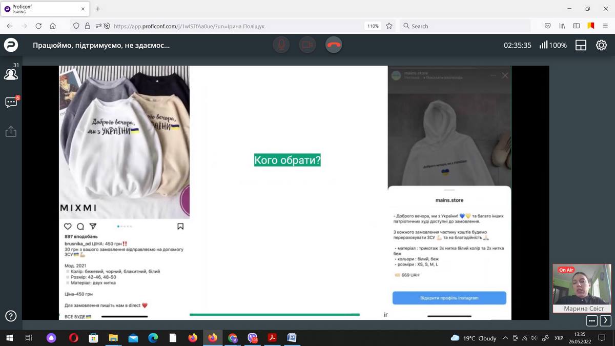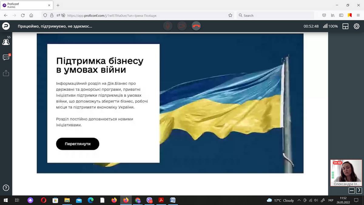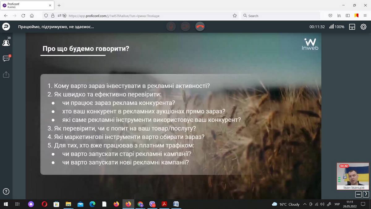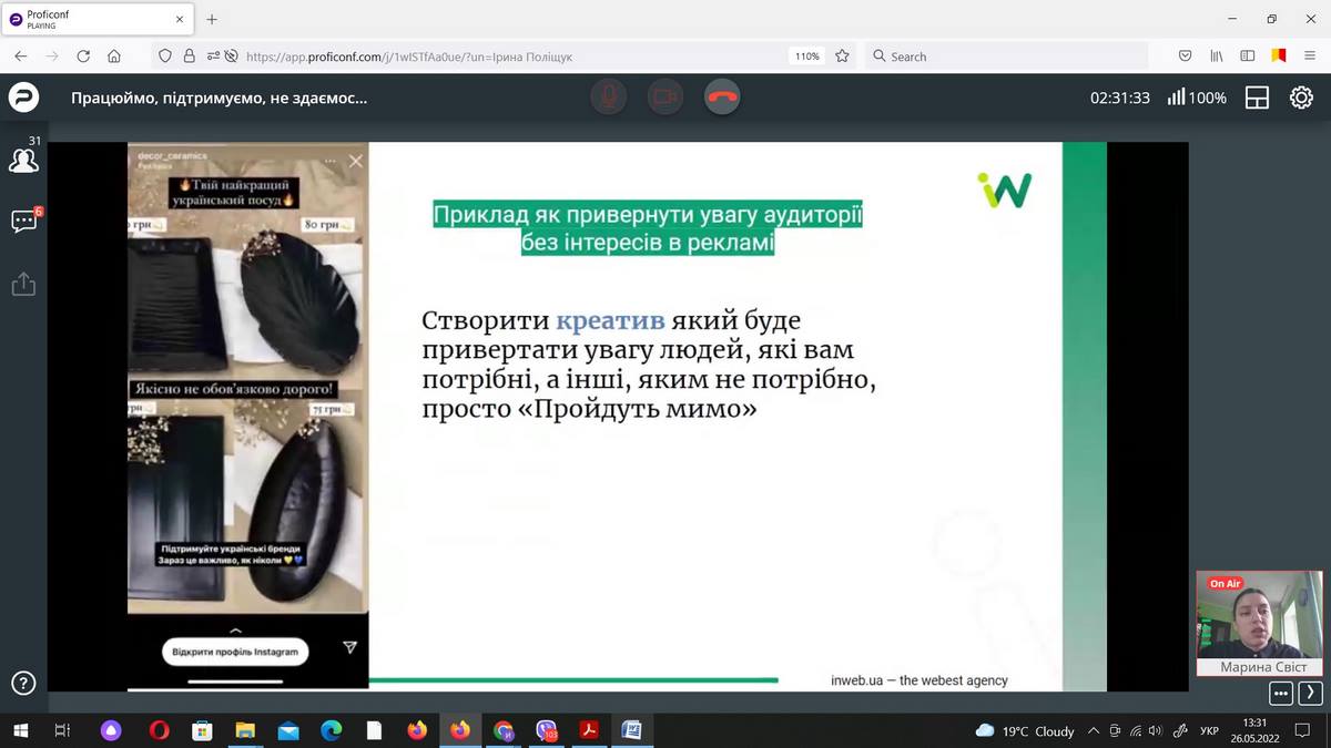 26 травня 2022 року науково-педагогічні працівники кафедри маркетингу та реклами і здобувачі ОП «Маркетинг» ВТЕІ ДТЕУ брали участь в онлайн-івенті «Працюймо, підтримуємо, не здаємось: що на часі для українського бізнесу» від Агенції digital-маркетингу Inweb.