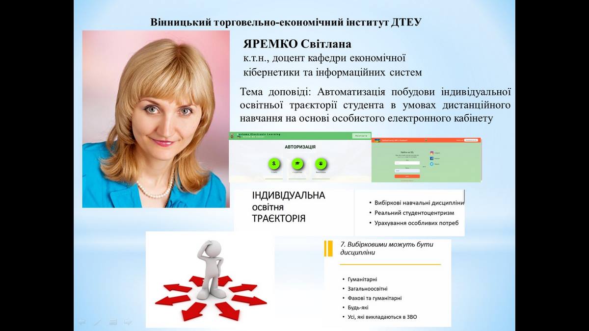 31 травня 2022 року на факультеті економіки, менеджменту та права відбувся всеукраїнський науково-практичний вебінар «Інтерактивний освітній простір ЗВО» в режимі online на платформі ZOOM. Захід проводився кафедрою економічної кібернетики та інформаційних систем спільно з кафедрою менеджменту та адміністрування. У роботі вебінару взяли участь: Державний університет інфраструктури та технологій, Вінницький національний медичний університет ім. М.І. Пирогова, Вінницький національний технічний університет, Вінницький навчально-науковий інститут економіки Західноукраїнського національного університету. До уваги учасників вебінару було запропоновано цікаві презентації доповідачів, далі відбулося активне обговорення доповідей, обмін корисним досвідом з організації інтерактивного освітнього простору, навчальних процесів та науково-дослідної роботи у ЗВО.