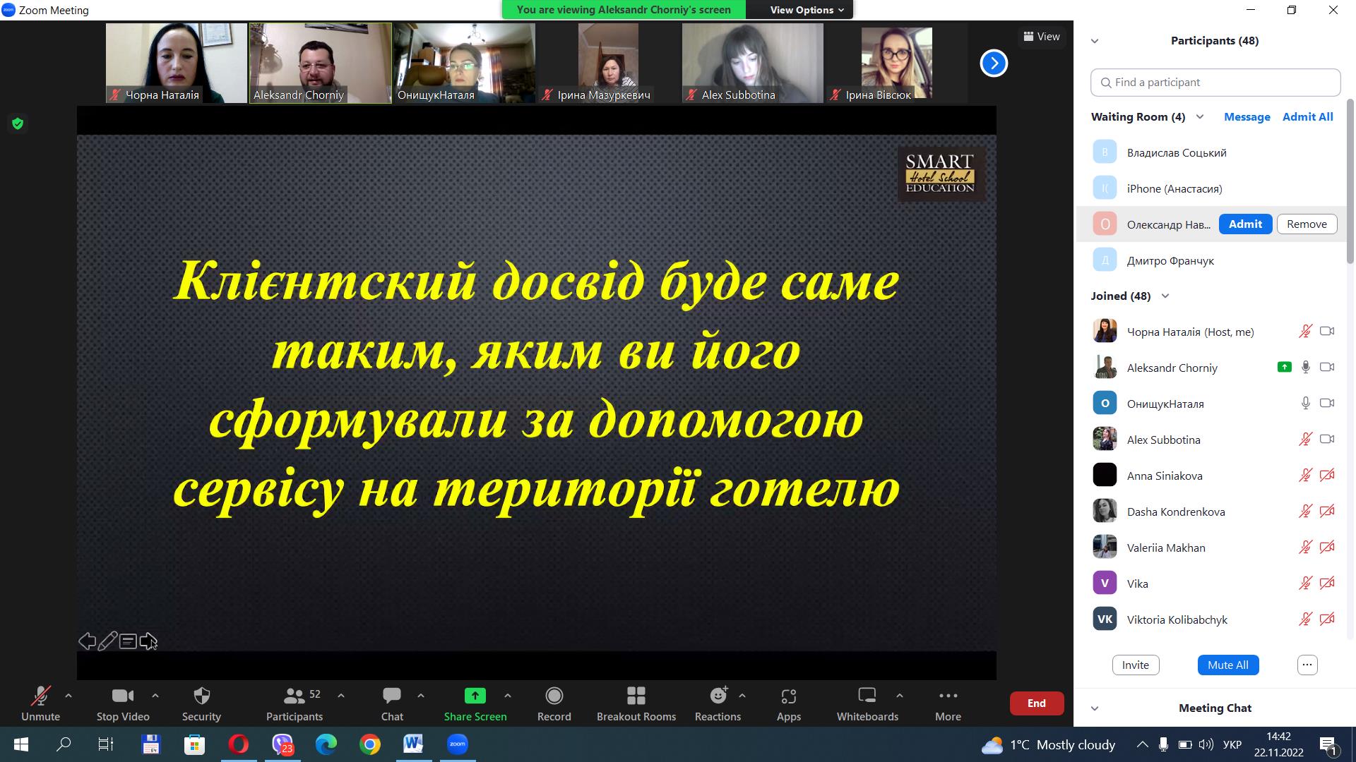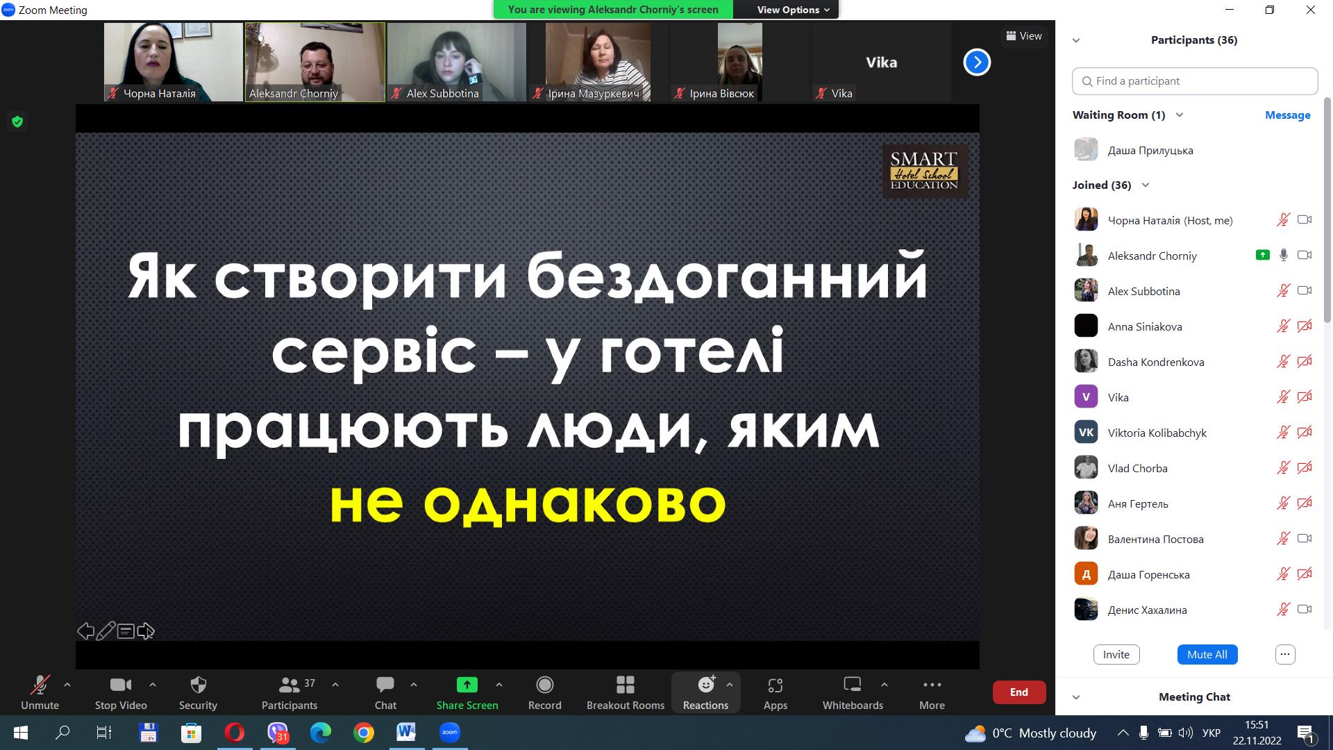 Проведений у рамках вивчення навчальних дисциплін «Готельна справа», «Управління бізнес-процесами в готельно-ресторанному бізнесі», «Поведінка споживачі послуг гостинності», семінар був корисним для здобувачів вищої освіти, і колектив кафедри туризму та готельно-ресторанної справи вдячний Олександру Чорному за його проведення.