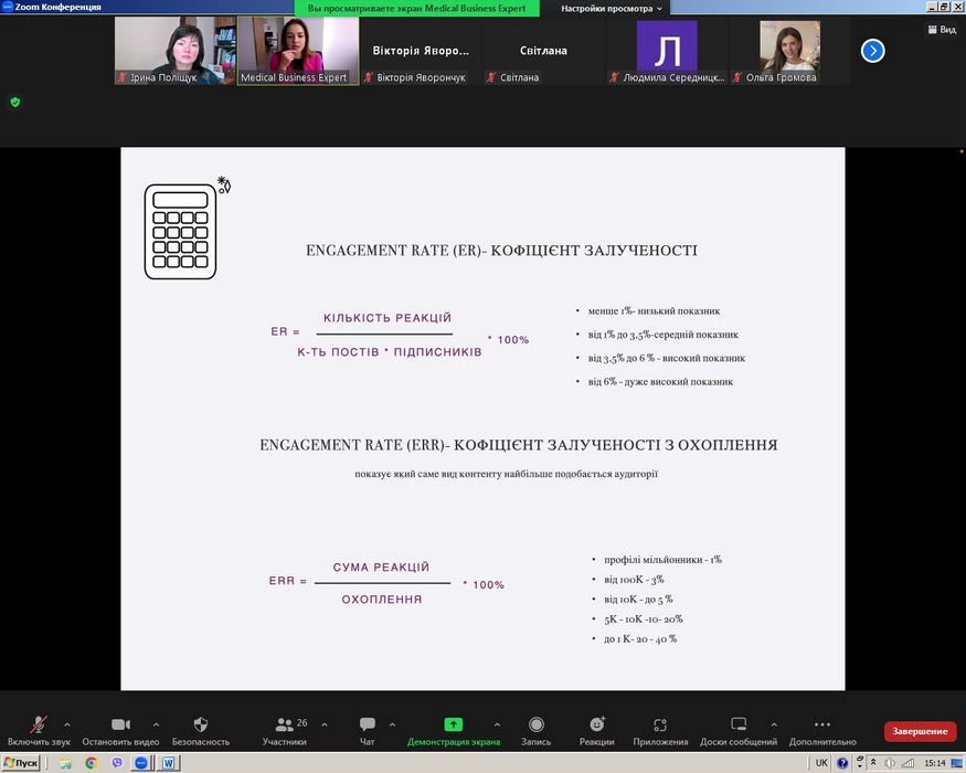 Пані Наталія розповіла особливості роботи маркетолога в SMM, з якими реаліями сьогодення стикаються SMM-щики, визначила ТОП-5 помилок початківців в даній області. Роз’яснила основні аспекти SMM-стратегії та контент-стратегії, визначила ефективні інструменти для залучення нової аудиторії. На запит здобувачів вищої освіти пані Наталія детально розглянула питання таргетингу, рекламних креативів та особливостей маркетингового аналізу результатів SMM.
