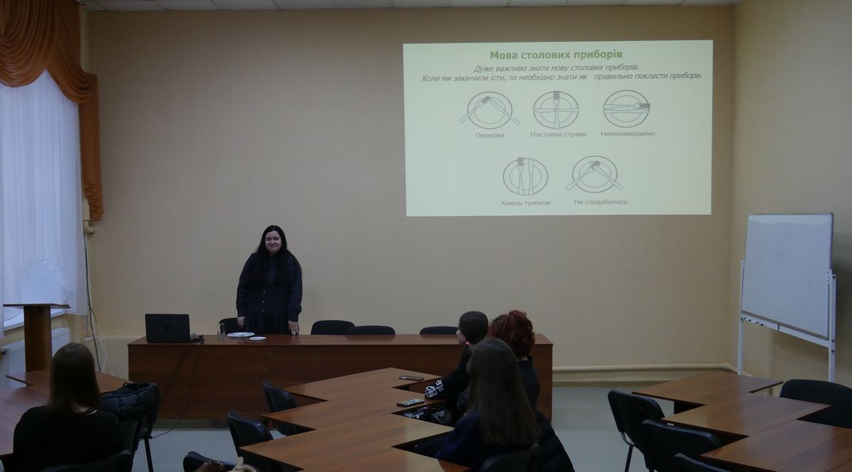 2 грудня 2022 року для учнів 11-А класу «Вінницький гуманітарний ліцей №1 ім. М.І. Пирогова» доцент кафедри туризму та готельно-ресторанної справи Валентина Постова провела лекцію-презентацію «Етикет зі смаком: тонкощі столового етикету». Мета лекції - поглиблення учнів про етикет і його важливість у житті людини, сприяння розвитку їх культурного рівня та формування навичок культурної поведінки за столом.