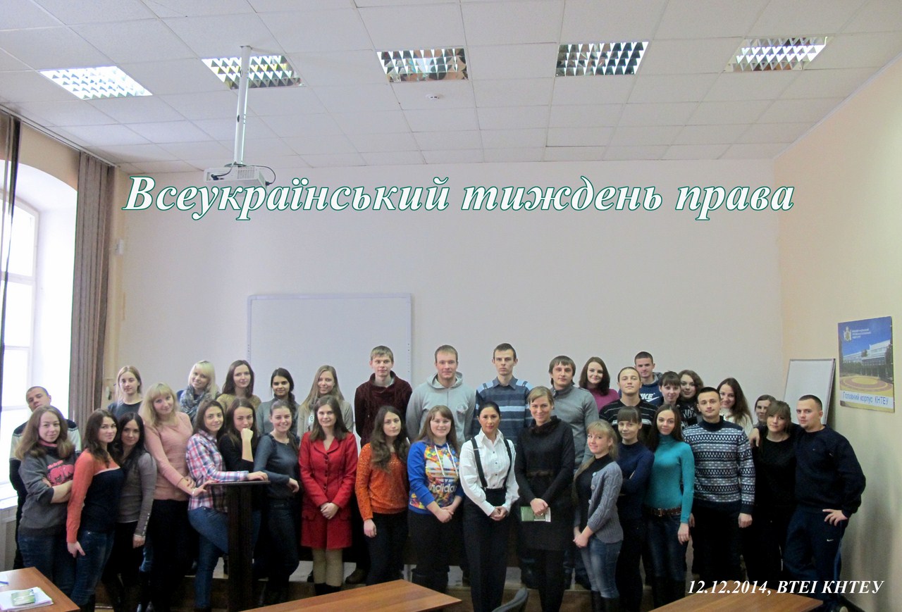 12 грудня 2014 року в аудиторії №17 першого корпусу ВТЕІ КНТЕУ в рамках «Всеукраїнського тижня права» для студентів інституту була проведена зустріч з адвокатом Вінницького обласного об’єднання колегії адвокатів Красномовець Наталією Петрівною. Тема доповіді: «Надання правової допомоги громадянам при захисті прав в суді та правоохоронних органах».
