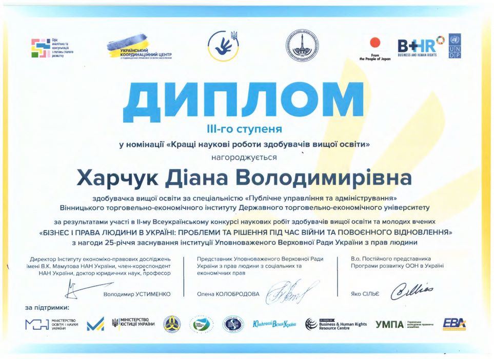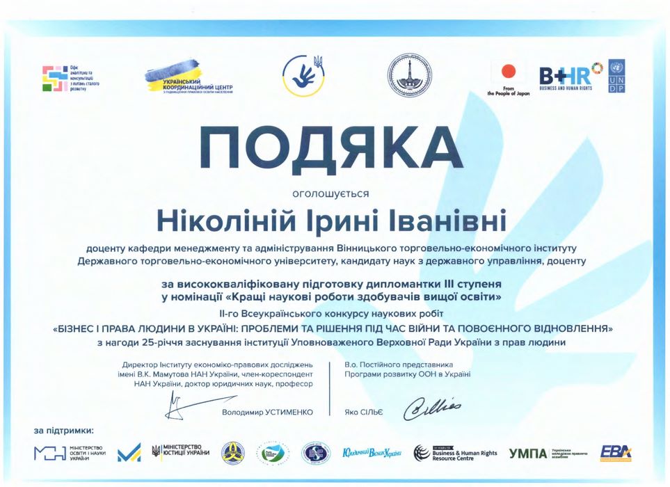Перемога у ІІ-му Всеукраїнському конкурсі наукових робіт здобувачів вищої освіти та молодих вчених «Бізнес і права людини в Україні: проблеми та рішення під час війни та повоєнного відновлення»