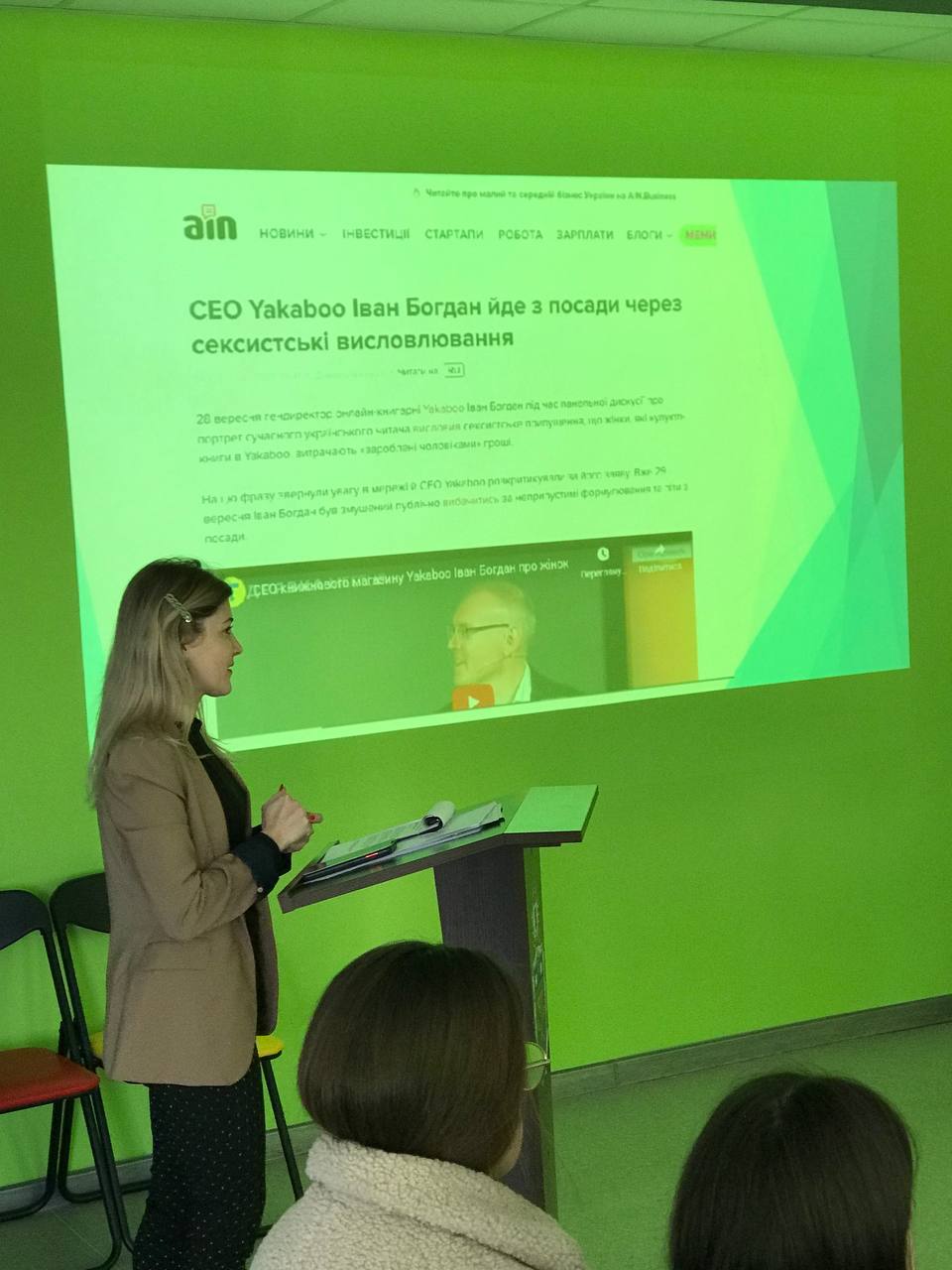 Експертка розповіла про те, які стереотипи при домашньому насильству найчастіше потрапляють у публічний простір, як їх розпізнавати і зупиняти поширення такого контенту. Говорили про хибні твердження у медіа, які можуть толерувати шкоду, заподіяну однією людиною іншій. На прикладах група попрактикувала визначати стереотипні повідомлення та «перекручену інформацію». Познайомилися з поняттям «медіаграмотність» у сенсі майбутньої професійної діяльності працівників в сфері права та працівників соціальних служб. Визначали – що і кому повідомляти, а яку інформацію варто залишити закритою для розголошення; яким чином будувати комунікації з журналістами, які висвітлюють тематику домашнього насильства.