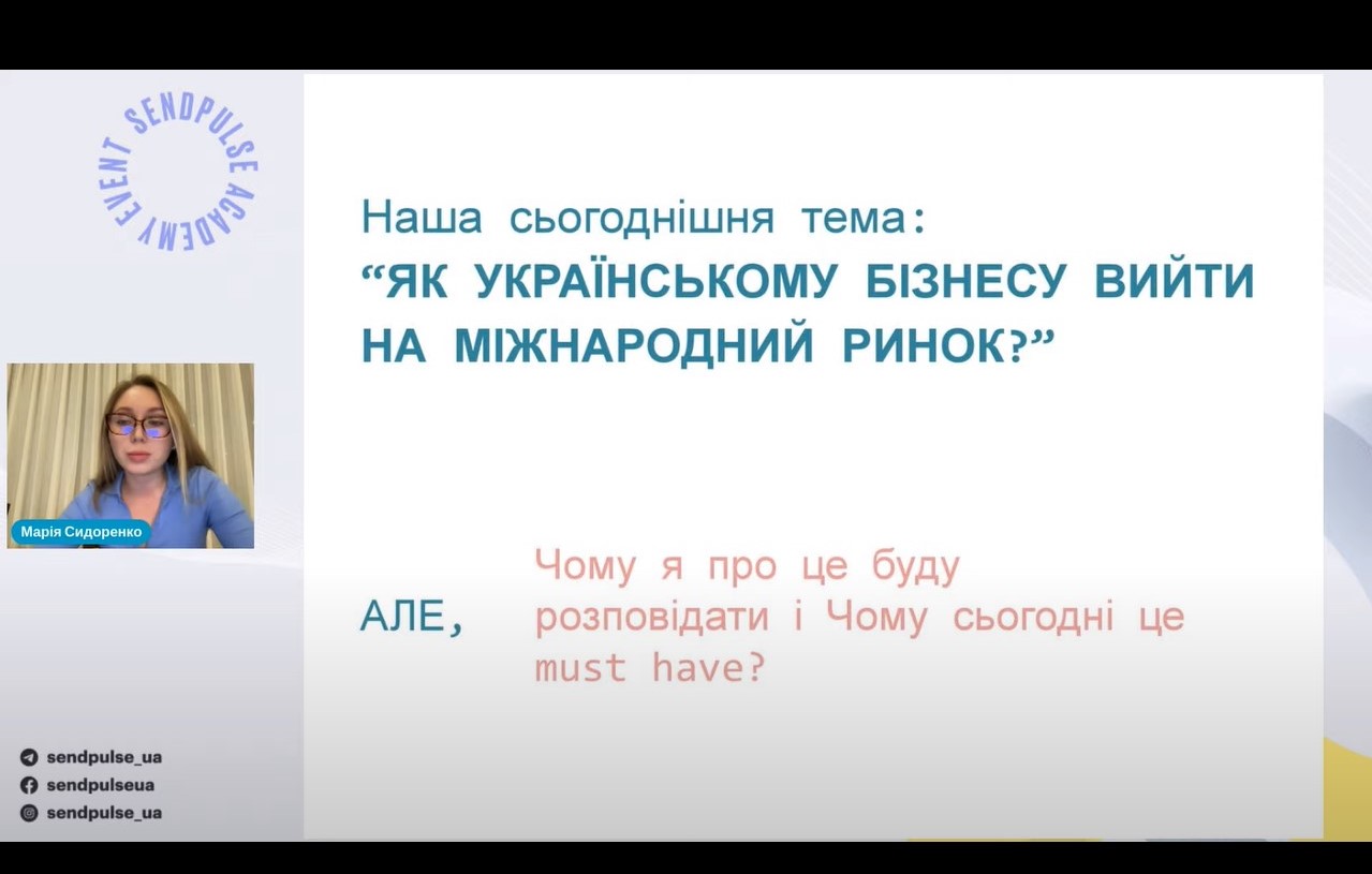 16 березня 2023 року студенти освітніх програм «Маркетинг», «Логістика» та науково-педагогічні працівники кафедри маркетингу та реклами ВТЕІ ДТЕУ взяли участь у вебінарі «Як українському бізнесу вийти на міжнародний ринок», який організований компанією «SendPulse».