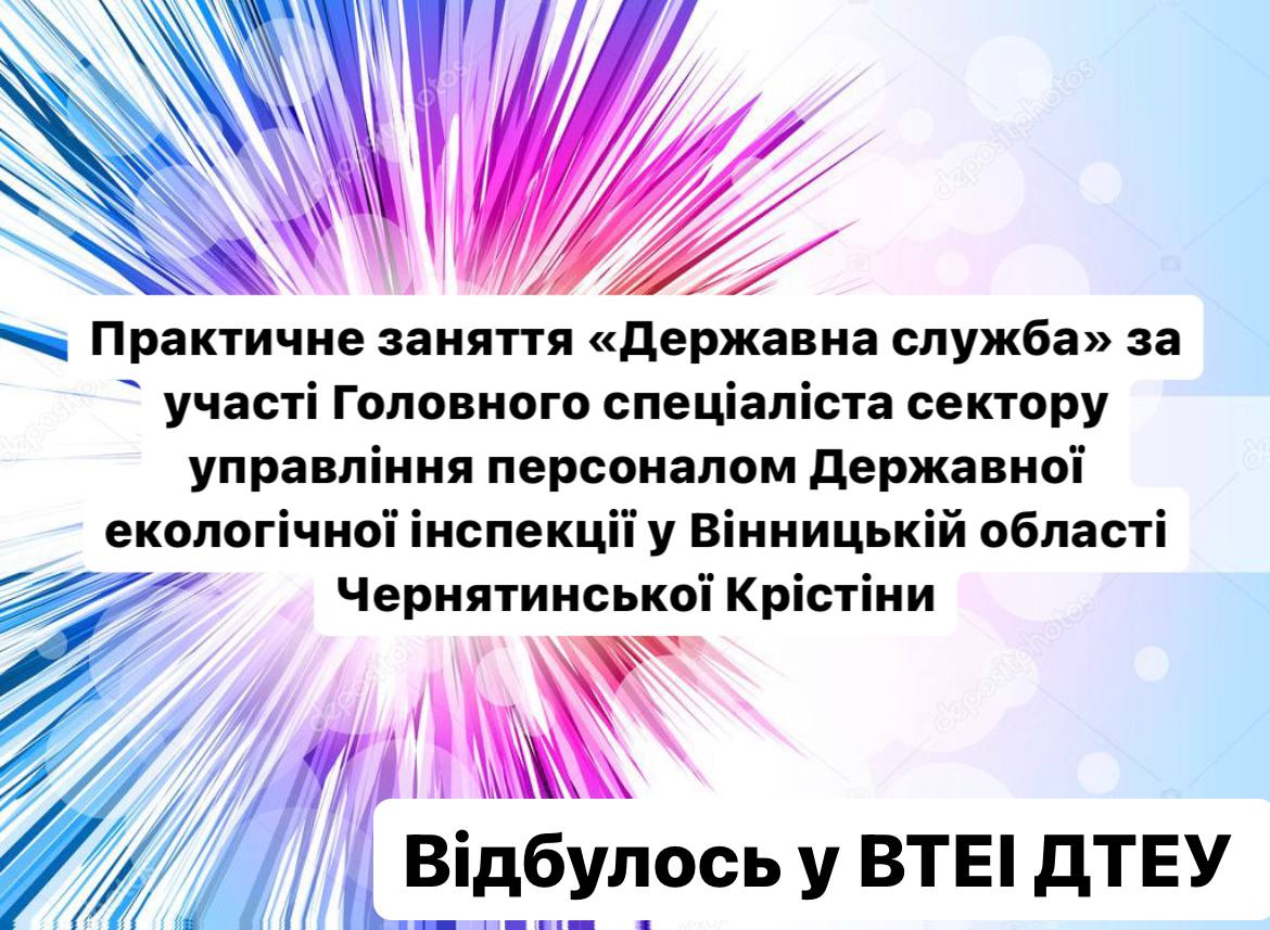 5 квітня 2023 року кафедрою менеджменту та адміністрування було організовано практичне заняття з дисципліни «Державна служба» за участі головного спеціаліста сектору управління персоналом Державної екологічної інспекції у Вінницькій області Чернятинської Крістіни. Гарант освітньої програми «Публічне управління та адміністрування» Наталя Махначова наголосила, що в сучасних умовах потрібно відслідковувати потреби та особливості діяльності органів публічної влади в умовах воєнного стану. Пані Крістіна ознайомила з умовами праці, процедурами кадрової діяльності в екологічній інспекції, а саме оцінюванням державних службовців, заповненням електронних декларацій, оцифровуванням трудових книжок працівників. Побажала студентам бути активними, розвиватися та постійно вдосконалювати свої навички.